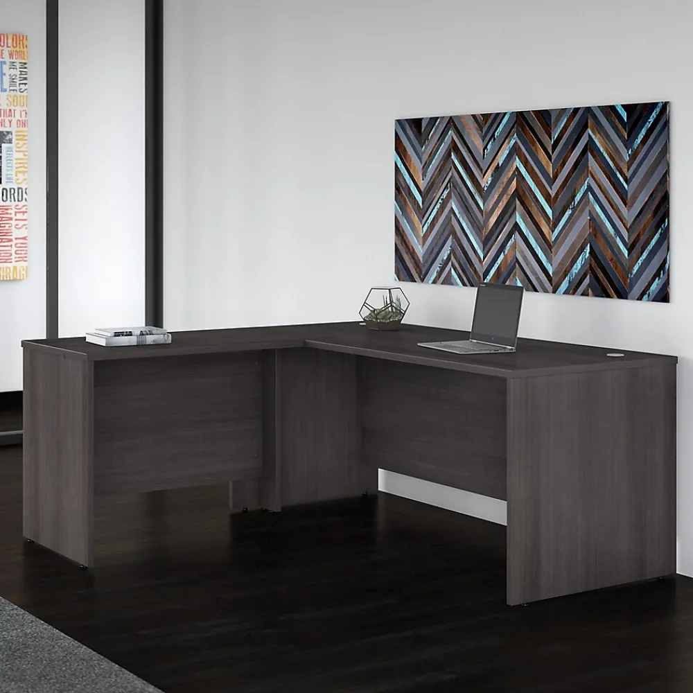 Highlighted by its contemporary style and commercial-quality design, the Bush Business Furniture Studio C 72″W L-shaped desk with 42″W return presents a perfect workspace for the modern professional. Take advantage of the spacious surface to spread out with a computer, paperwork, and more as you tackle your next big project. The L-shaped desktop easily accommodates multiple monitors and other materials with a 200 lb. weight capacity and built-in wire management grommets. Position the L-desk in a corner to save space in a small private office, or make use of the finished back to face outward in an open-plan environment. The return can be installed on either side of the main work surface for a right- or left-handed configuration. This corner desk is tested to meet ANSI/BIFMA standards for safety and performance and is backed by a 10-year warranty. American-made with US and imported parts.