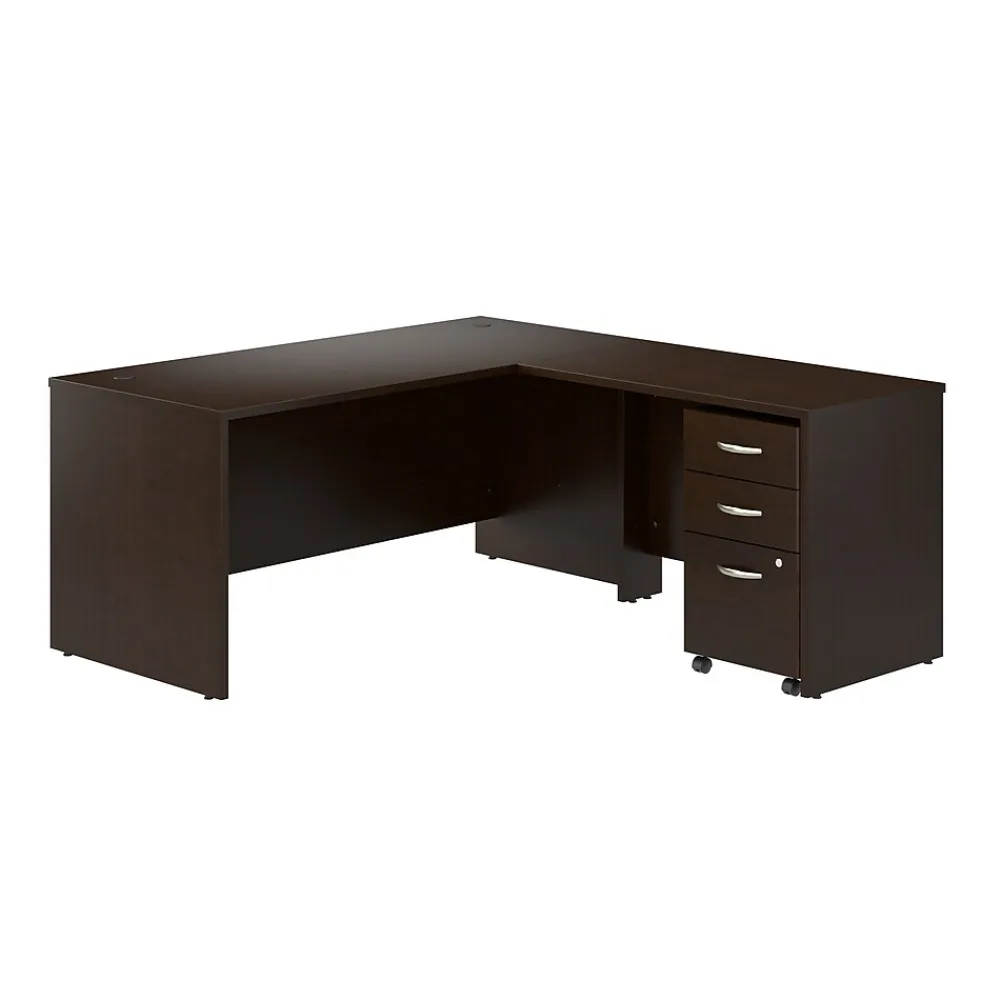 The Bush Business Furniture Westfield 66W L Shaped Desk with 42W Return and Mobile File Cabinet offers a commercial quality workspace solution with the style and functionality today’s professionals demand. The desktop easily accommodates multiple monitors and other materials with a 200-pound weight capacity and built-in wire management grommets. The return can be installed on either side of the main work surface for a right or left-handed configuration, giving this L shaped computer desk the ability to adapt to any office layout. The rolling file cabinet’s lower drawer accepts letter, legal, and A4-size paperwork while two box drawers organize writing utensils and other small office supplies. This L shaped office desk with drawers is tested to meet or exceed ANSI/BIFMA standards for safety and performance and is backed by a 10 Year Warranty. American made with U.S. and imported parts.