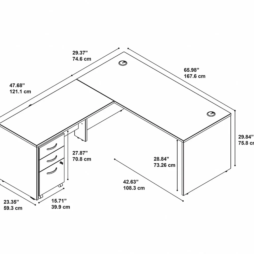 | Furniture Mobility Any additional furniture pieces that come with the desk as a bundle. Ex. Hutch, round table, desk return. | Bundle includes: 66W Desk with 48W Return and 3 Drawer Mobile Pedestal |