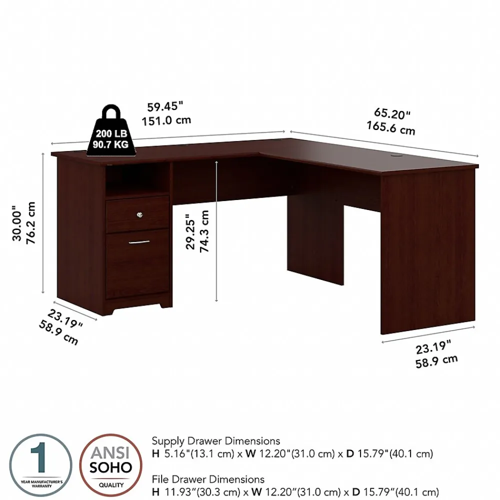 The Bush Furniture Cabot 60W L Shaped Computer Desk with Drawers presents a home office solution with transitional style. Take advantage of the 60-inch L Shaped Desk surface to spread out with a computer and all the materials needed to power through your next project or assignment. The durable desktop supports up to 200 pounds and includes built-in wire management to keep cords and cables out of the way while you work. A single file drawer opens on smooth full-extension ball bearing slides for an effortless reach to letter, legal, and A4-size paperwork. The box drawer organizes writing utensils, notepads, and other small office supplies while the open cubby shelf is perfect for work-in-progress and frequently used materials. This corner desk with storage has been rigorously tested to meet or exceed ANSI/SOHO quality standards for safety and performance and is backed by a 1 Year Warranty.