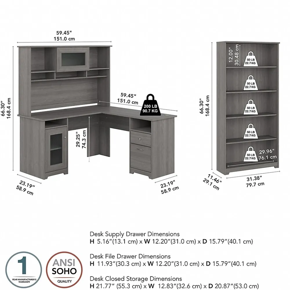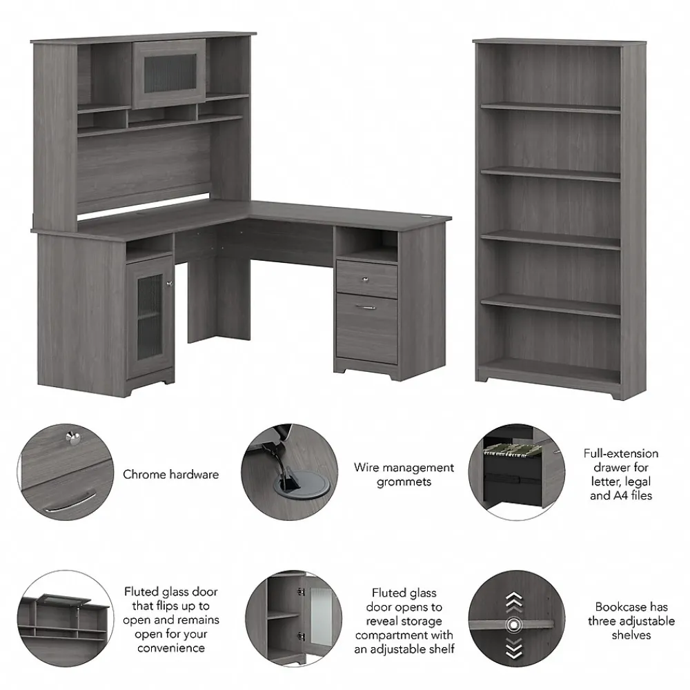 The Bush Furniture Cabot 60W L Shaped Computer Desk with Hutch and 5 Shelf Bookcase presents a home office solution with transitional style. The L Shaped Desk surface supports up to 200 pounds and includes built-in wire management to keep cords and cables out of the way. Organize materials inside a storage cabinet with an adjustable shelf while using the file drawer and box drawer to keep paperwork and office supplies close by. The Desk Hutch adds another closed compartment behind a fluted glass door along with right and left shelves for flexible storage and display. The Tall Bookcase includes three adjustable shelves to accommodate books and decorations of various sizes while two shelves are fixed for stability. This corner desk with bookshelf and hutch has been rigorously tested to meet or exceed ANSI/SOHO quality standards for safety and performance and is backed by a 1 Year Warranty.