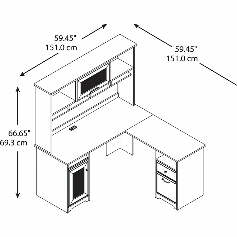The Bush Furniture Cabot 60W L Shaped Computer Desk with Hutch and Storage presents a home office solution with transitional style. The spacious L Shaped Desk surface supports up to 200 pounds and includes built-in wire management to keep cords and cables out of the way. Organize materials and supplies inside a storage cabinet that contains one adjustable shelf. The file drawer opens on smooth full-extension ball bearing slides for an effortless reach to letter, legal, and A4-size paperwork while a smaller box drawer keeps small office supplies in order. The Desk Hutch adds another closed compartment behind a fluted glass door along with right and left shelves for flexible storage and display. This corner desk with drawers, storage cabinet, and hutch has been rigorously tested to meet or exceed ANSI/SOHO quality standards for safety and performance and is backed by a 1 Year Warranty.