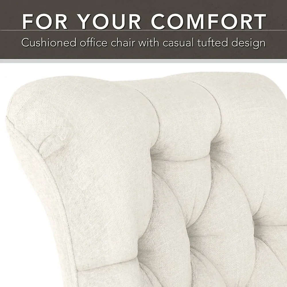 - Office chair’s casual button-tufted upholstery perfectly complements the desk’s relaxed appearance