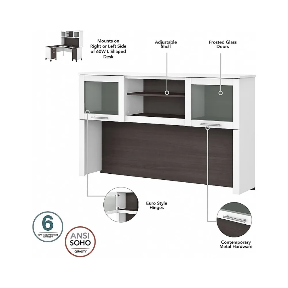 Maximize the potential of your home office with the Bush Furniture Somerset 60″W L-shaped desk with hutch. Create your remote work headquarters with space for a computer, phone, printer, and more. A convenient pullout shelf provides a perfect place to keep a keyboard or laptop, while a storage cabinet and box drawer offer plenty of space for supplies. A file drawer with ball bearing slides allows for easy access to letter-size documents. A wire management slot helps keep cords and cables in order. The hutch features open compartment for books or decorations, an adjustable shelf to hold work in progress, and two frosted glass doors that provide concealed storage. This home office furniture set is tested to meet ANSI/SOHO standards for safety and performance and is backed by the Bush Furniture 6-year manufacturer warranty. American-made with US and imported parts.