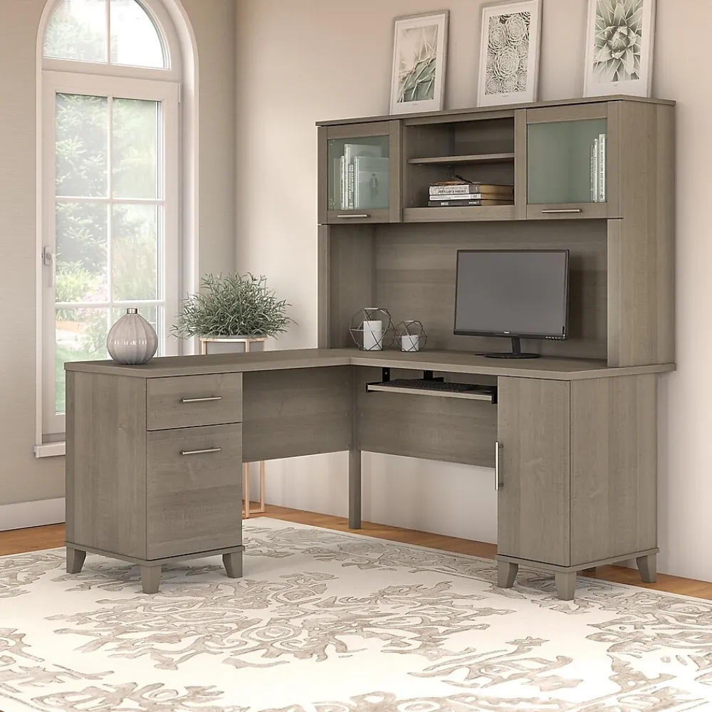 Maximize the potential of your home office with the Bush Furniture Somerset 60W L Shaped Desk with Hutch. Create your remote work headquarters with space for a computer, phone, printer and more. A convenient pull-out shelf provides a perfect place to keep a keyboard or laptop, while a storage cabinet and box drawer offer plenty of storage for supplies. A file drawer with ball bearing slides allows for easy access to letter size documents. Wire management slots help keep cords and cables in order. The Hutch features open storage with a large compartment for books or decorations, an adjustable shelf to hold work-in-progress, and 2 lift-up frosted glass doors that provide concealed storage. This office furniture set is tested to meet ANSI/SOHO standards for safety and performance and is backed by the Bush Furniture 6 Year Manufacturer’s Warranty. American made with U.S. and imported parts.