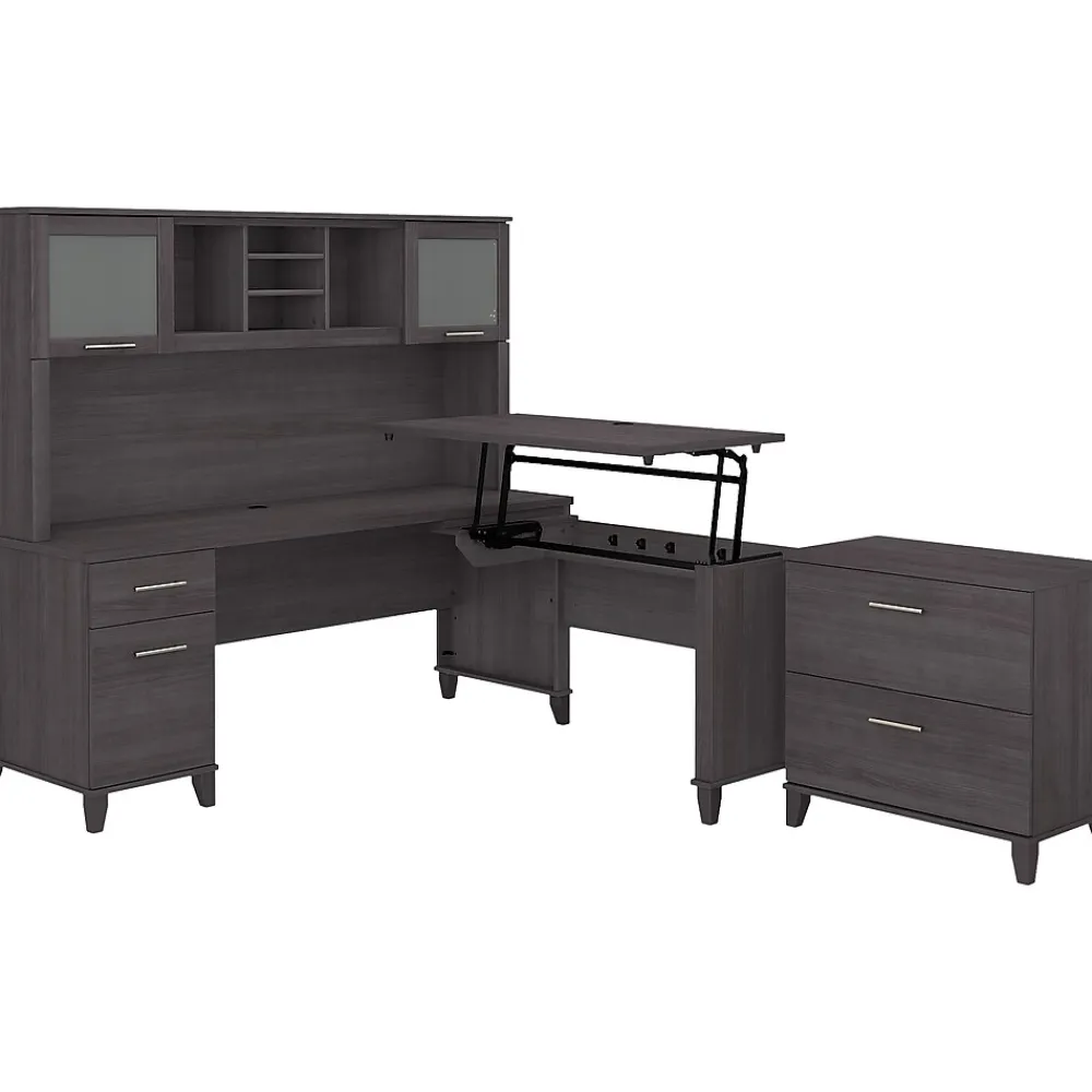 The Bush Furniture Somerset 71″W three-position adjustable desk with hutch and file cabinet offers an ergonomic solution for the home or small office. This furniture set is a perfect solution for those seeking for a stylish and functional ergonomic workspace. The mechanical Lift-n-Lock system allows the 42″W x 24″D return to lock into place at standing heights of 35″, 38″, and 41″ and easily return to a seated position. The 71″W x 24″D office desk includes its own storage with a file drawer and a box drawer for documents and supplies you want to keep close by. The hutch adds two frosted glass doors for concealed storage as well as open cubby spaces with two shelves. The two-drawer file cabinet accepts legal- and letter-size paperwork. Fixed surfaces are tested to meet ANSI/SOHO standards for safety and performance while the mechanical lift system is rigorously tested to Bush Furniture’s own quality standards. Backed by a 6-year warranty.