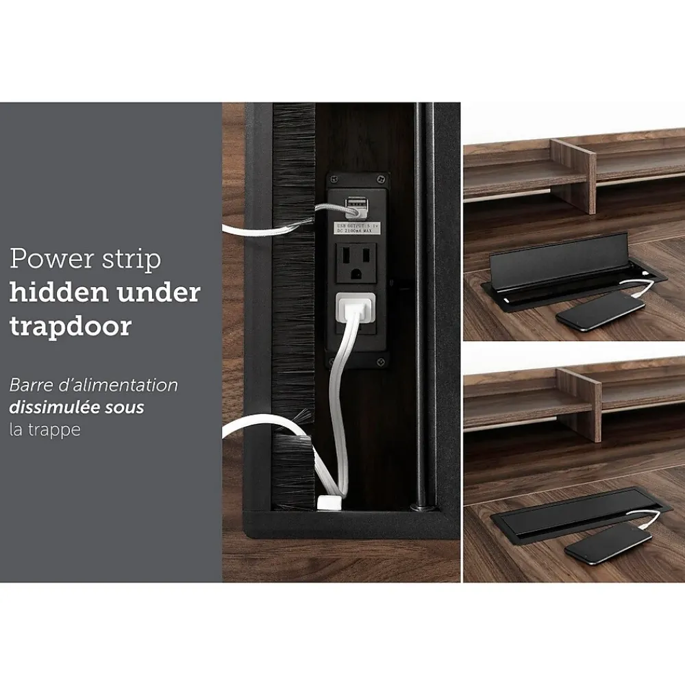 - Features a power strip with two USB ports and two regular outlets hidden under a trapdoor on the surface for a more discreet look and an optimal functionality