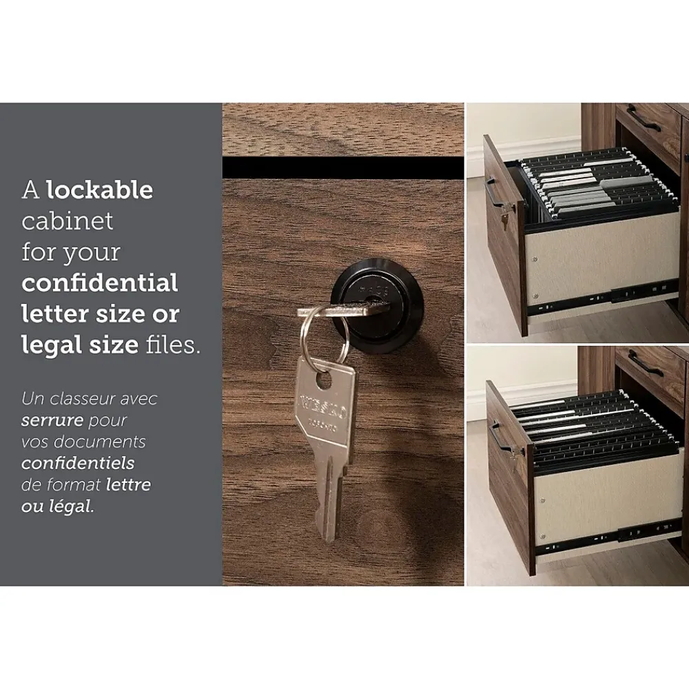 - Offers two small drawers and one large file drawer that locks with a key, as well as one fixed and one adjustable shelves, and eight open spaces for better access (including four in the hutch)
