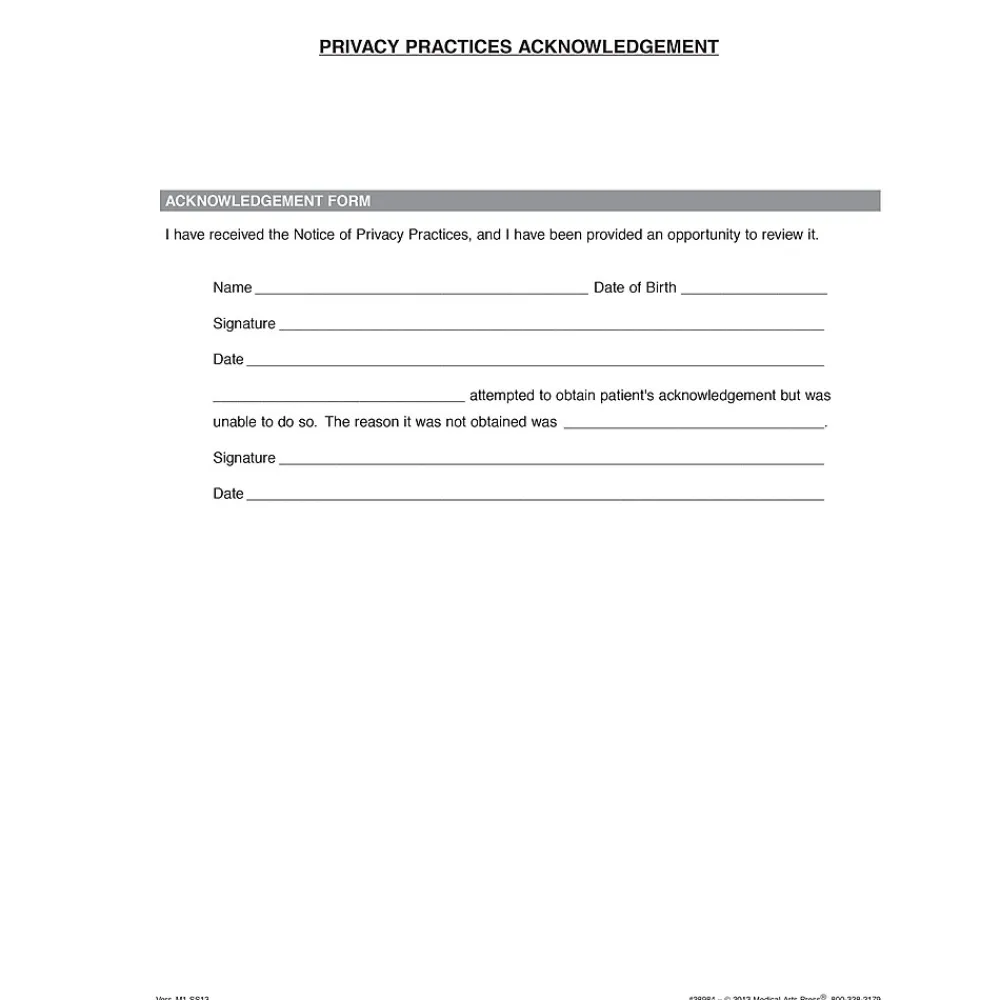 Documents the patient’s acknowledgement that they have received and reviewed the Notice of Privacy Practices (#28998). One page; 8-1/2×11″.