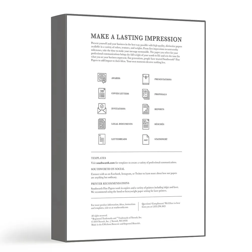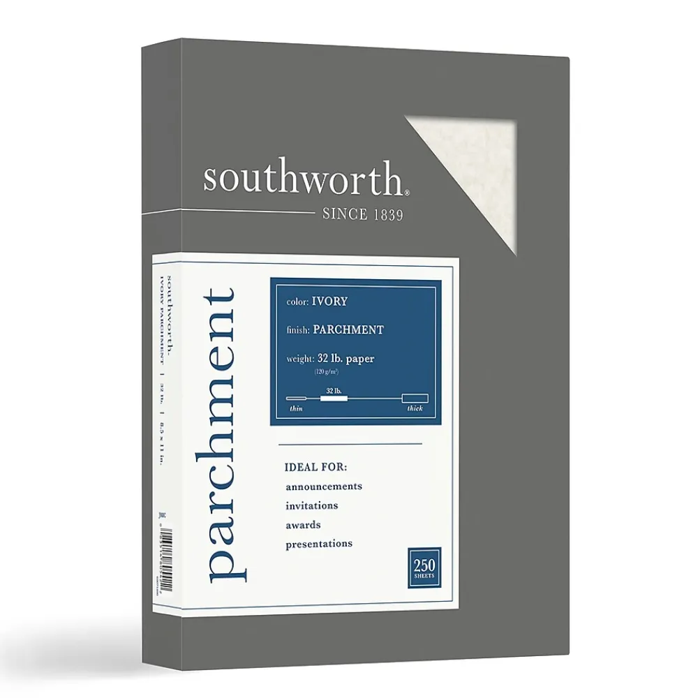 Use this 32-pound, acid-free paper for reports, presentations, awards, and other documents intended for long-term use and archival storage. This box includes 250 sheets of letter-sized Southworth parchment paper to help you easily craft large volumes of beautiful documents.