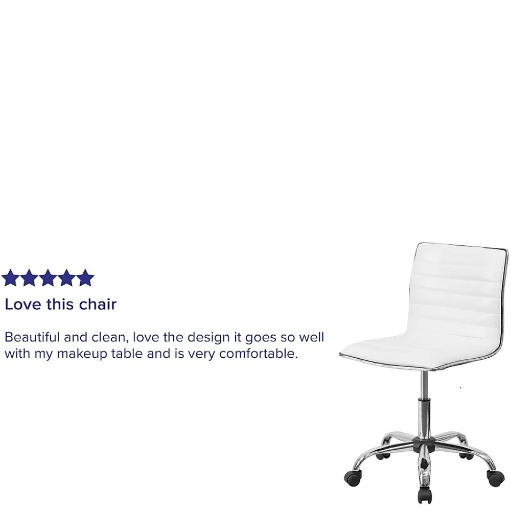 Modern accents and a sleek profile make this ribbed office task chair a perfect addition to your office. A streamlined silhouette combined with the armless design can breathe new life into a small workspace and not only allows room for more board members, clients or visitors but also permits you to roll further under a desk or table. The glossy white vinyl upholstery with a chrome metal border paired with a matching chrome frame and base gives an up-market feel to any professional space. The low back design and foam molded seat and back provide lower back support. A pneumatic seat height adjustment lever lets you easily position the chair while the 360° swivel gives you access to all of your work surfaces. This sturdy task chair has a heavy duty, 5-star chrome base with dual-wheel casters. Spills clean up easily with water followed by a dry cloth.