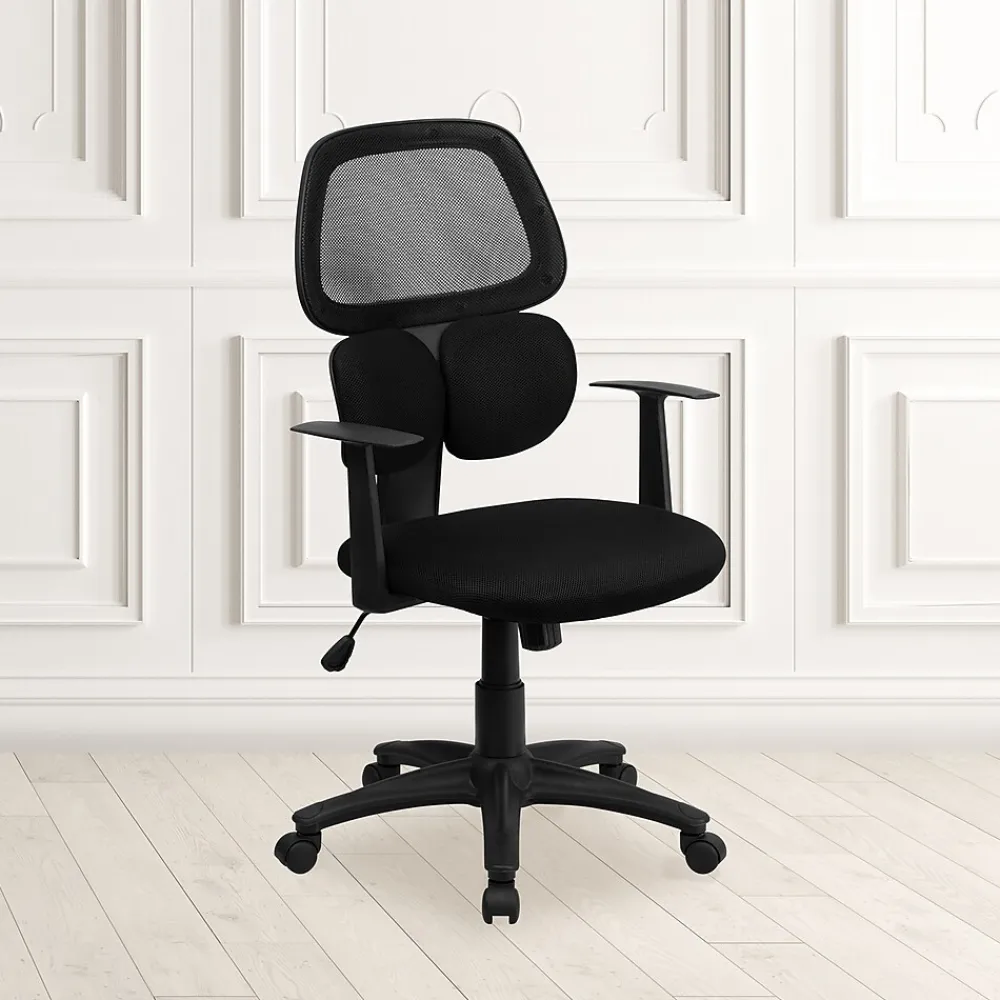 This uniquely designed office chair features dual lumbar support cushions that flex and provides extreme comfort. Mesh office chairs can keep you more productive throughout your work day with its comfort and ventilated design. The breathable mesh material allows air to circulate to keep you cool while sitting. The mid-back design offers support to the mid-to-upper back region. The back tilts to change the angle of your torso to reduce disc pressure. The waterfall front seat edge removes pressure from the lower legs and improves circulation. Chair easily swivels 360 degrees to get the maximum use of your workspace without strain. The pneumatic adjustment lever will allow you to easily adjust the seat to your desired height.