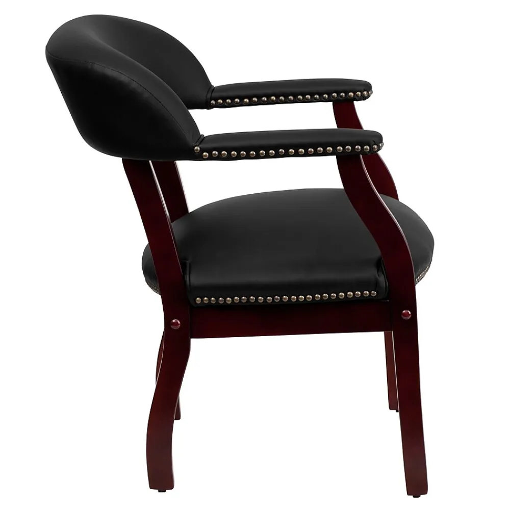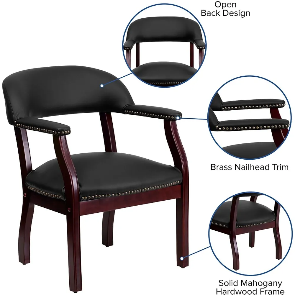 Invite clients, vendors or staff to meet in your executive office with this Flash Furniture fixed-arm conference chair. The luxurious LeatherSoft upholstery delivers upscale style and an inviting texture, while the brass nailhead trim accents give this chair a classic look. Thickly padded, curved cushions offer added support and comfort for long meetings, so your VIP guests can enjoy a better seating experience. With padded fixed arms, this chair provides a convenient way to rest the upper back and shoulders. Durable construction ensures long-lasting use in your waiting room, boardroom or private office, while the rich mahogany finish on this Flash Furniture fixed-arm conference chair adds a refined finishing touch.