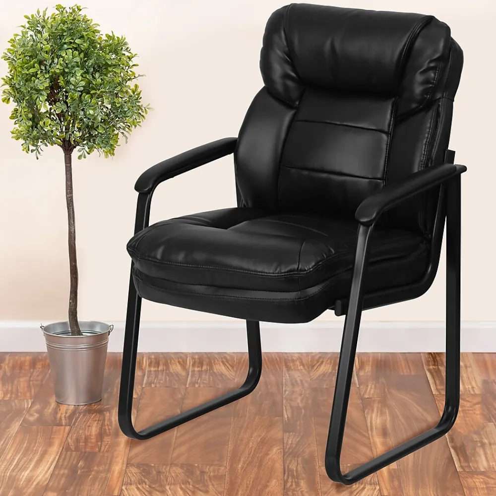 Place the Flash Furniture LeatherSoft Executive Side Chair in the waiting room or guest area for creating a comfortable seating arrangement. It has an extensively padded seat and back that provide adequate support to your body. The LeatherSoft side chair’s cushions contain CA117 fire retardant foam for extra safety. It has curved padded arms that allow you to rest your forearms comfortably. Featuring a black metal sled base frame with floor glides, the executive chair keeps your floor protected from scuffs.