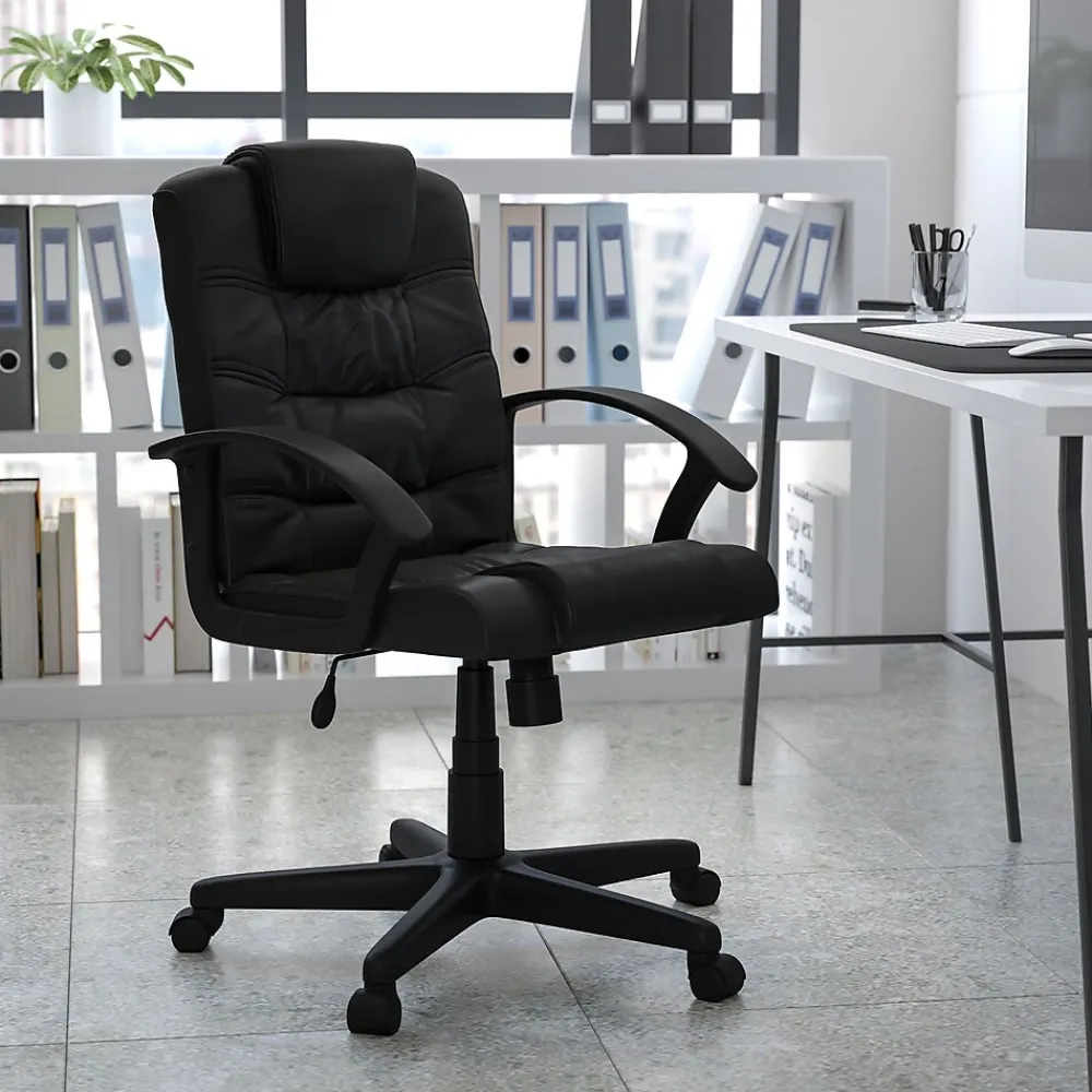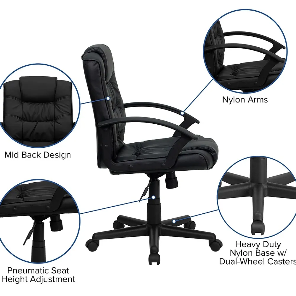 Upgrade your office seating with this mid-back black LeatherSoft upholstered swivel task office chair. A mid-back office chair offers support to the mid-to-upper back region. Chair easily swivels 360 degrees to get the maximum use of your workspace without strain. LeatherSoft is leather and polyurethane for softness and durability. The tilt lock mechanism rocks/tilts the chair and locks in an upright position while the tilt tension adjustment knob adjusts the chair’s backward tilt resistance. The pneumatic adjustment lever will allow you to easily adjust the seat to your desired height. This computer chair is perfect for the office or in the home. From behind the desk to the meeting room this chair can provide a seamless addition to your work space.