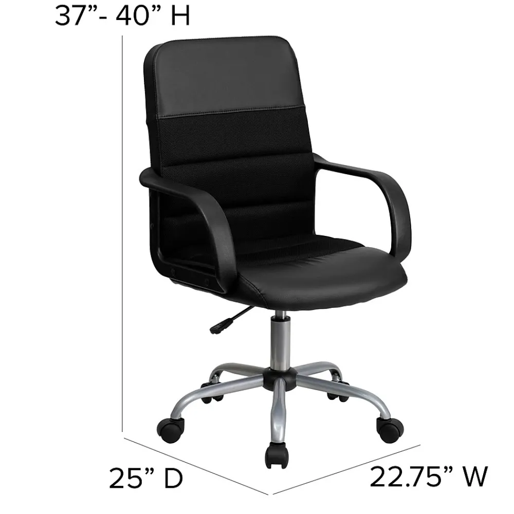 Upgrade your seating at work with this LeatherSoft and mesh upholstered office chair. The combination upholstery will complement your office whether it is downtown or you work from home. Mesh office chairs can keep you more productive throughout your work day with their comfort and ventilated design. The breathable mesh material allows air to circulate to keep you cool while sitting. LeatherSoft is leather and polyurethane for added softness and durability. A mid-back office chair offers support to the mid-to-upper back region. Chair easily swivels 360 degrees to get the maximum use of your workspace without strain. The pneumatic adjustment lever will allow you to easily adjust the seat to your desired height.