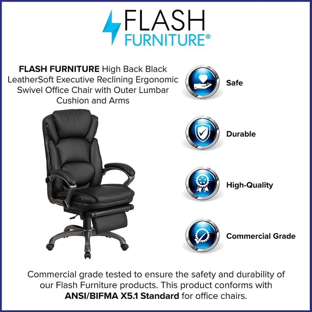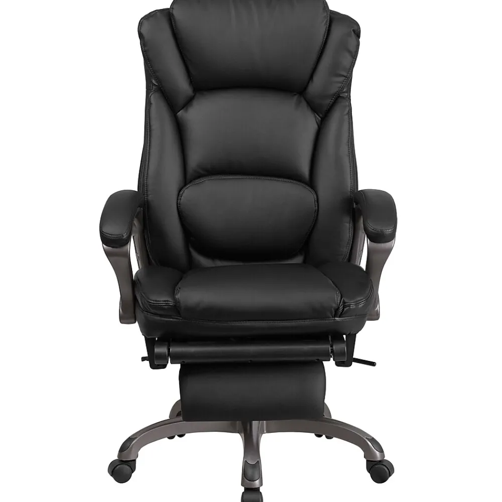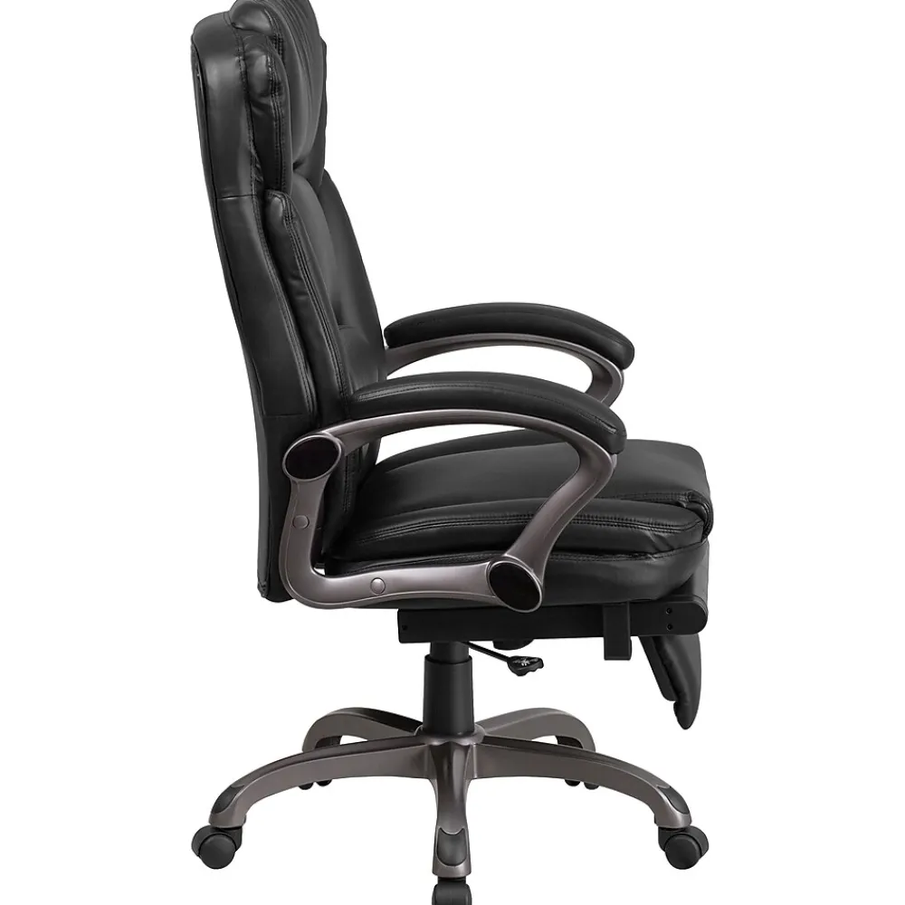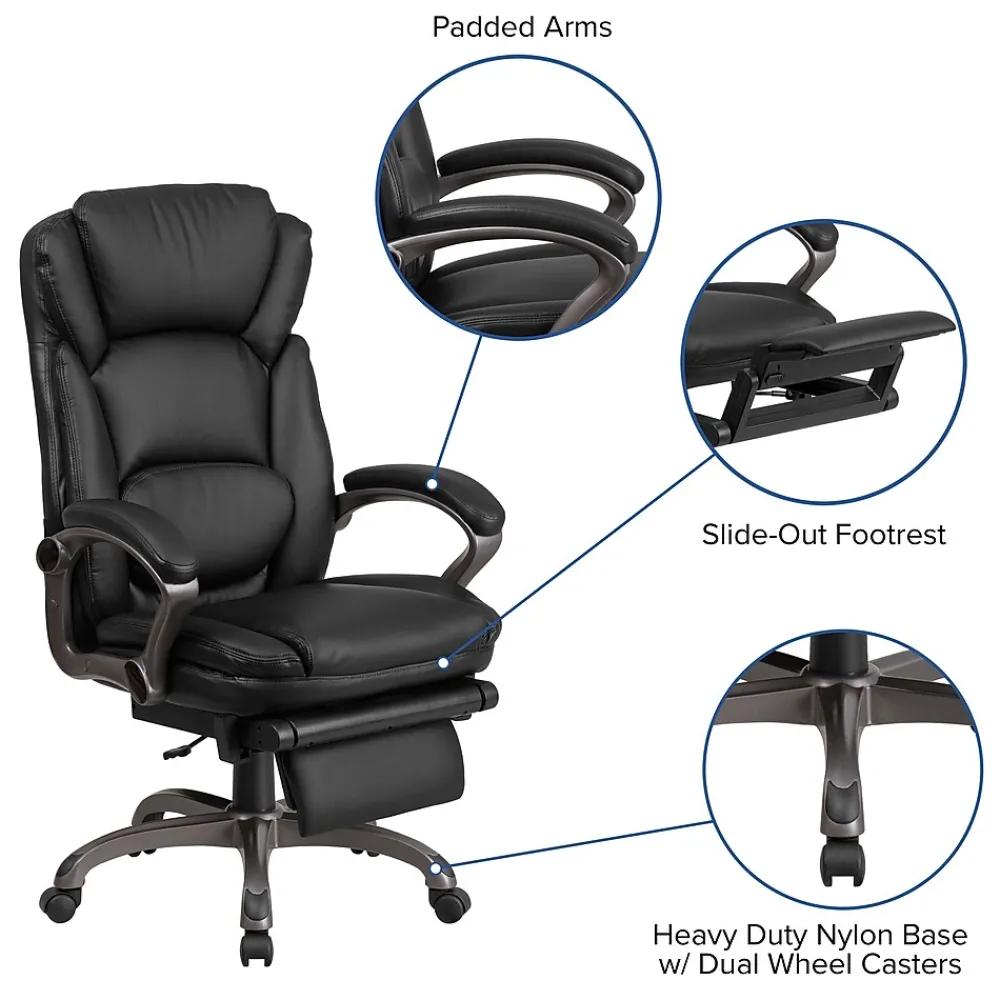 When you have had a long workday and need to ease body fatigue, this reclining ergonomic executive office chair will be a lifesaver. The high back design with headrest and black LeatherSoft upholstery will look great in your workspace. LeatherSoft is leather and polyurethane for added softness and durability. The tilt lock mechanism rocks/tilts the chair and locks in an upright position while the tilt tension adjustment knob adjusts the chair’s backward tilt resistance. You can go from a seated position to a relaxed, reclined state in seconds with the touch of a lever. The outer lumbar pillow provides firm back support while the contoured seat dissipates pressure points for greater comfort. This office chair offers pneumatic seat height adjustment and a slide out footrest.When you’re ready to get back to business this functional task chair will let you get on with your day, and feel good while doing it.
