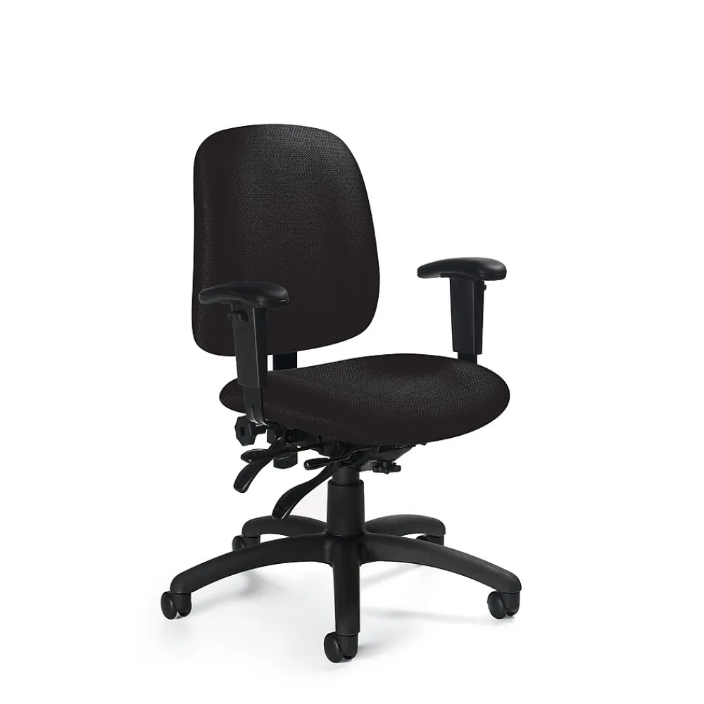 Global Goal Urban black coal low back multi tilter chair featuring height adjustable arms has self-skinned urethane armrests for comfortability. Chair has a common lever operator control for adjusting seat and back angles.