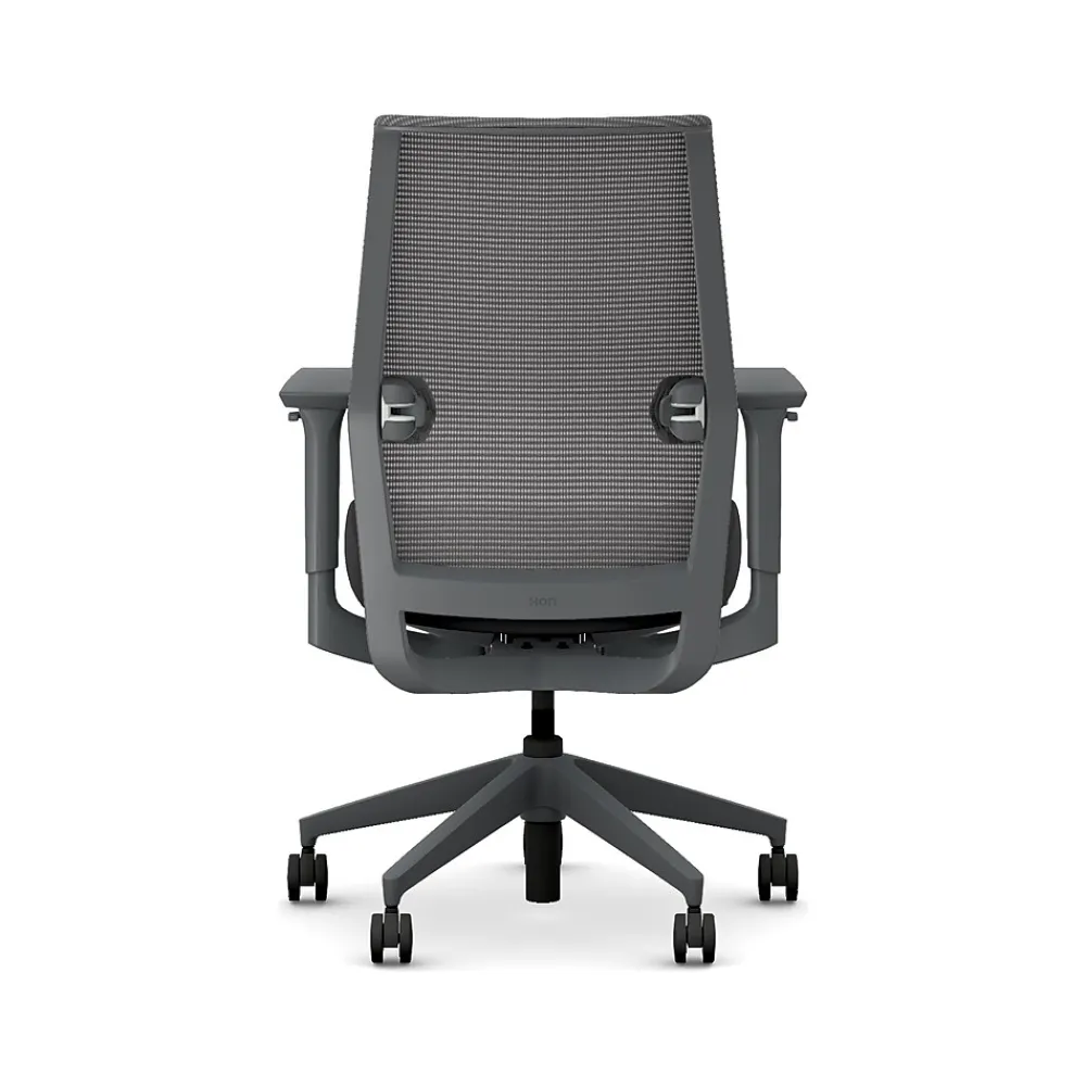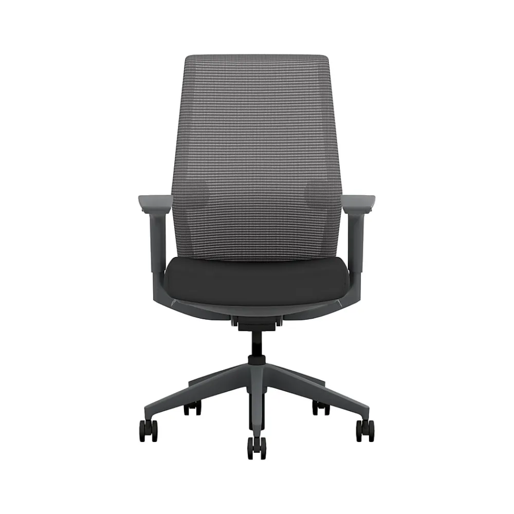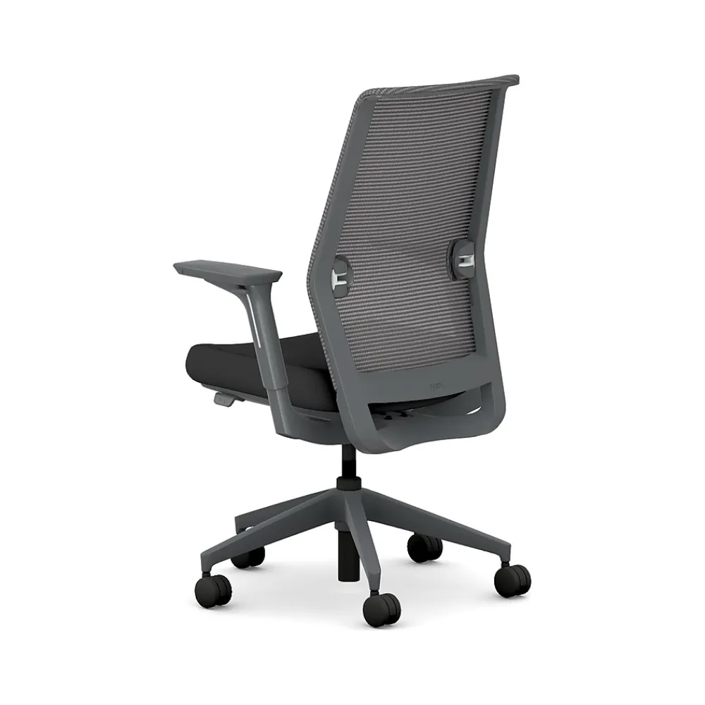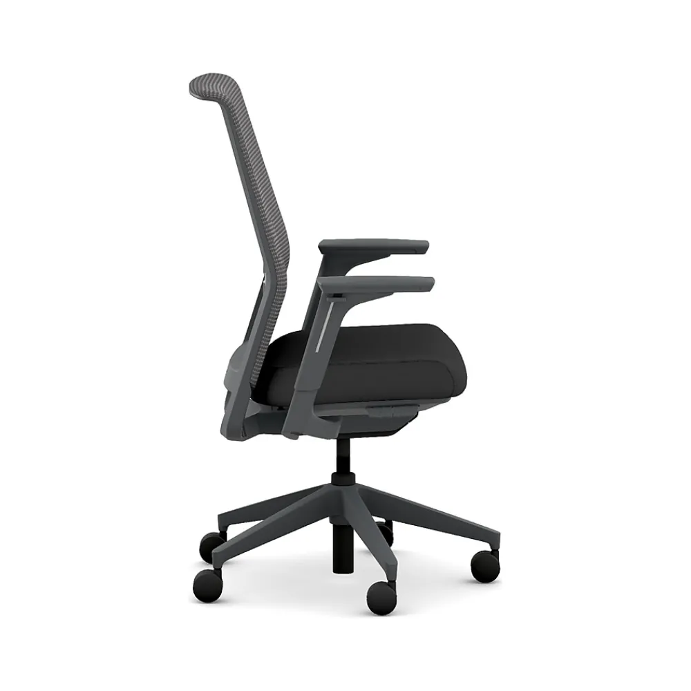 - Four-way stretch mesh back in charcoal gray, Centurion black fabric seat, and charcoal gray frame