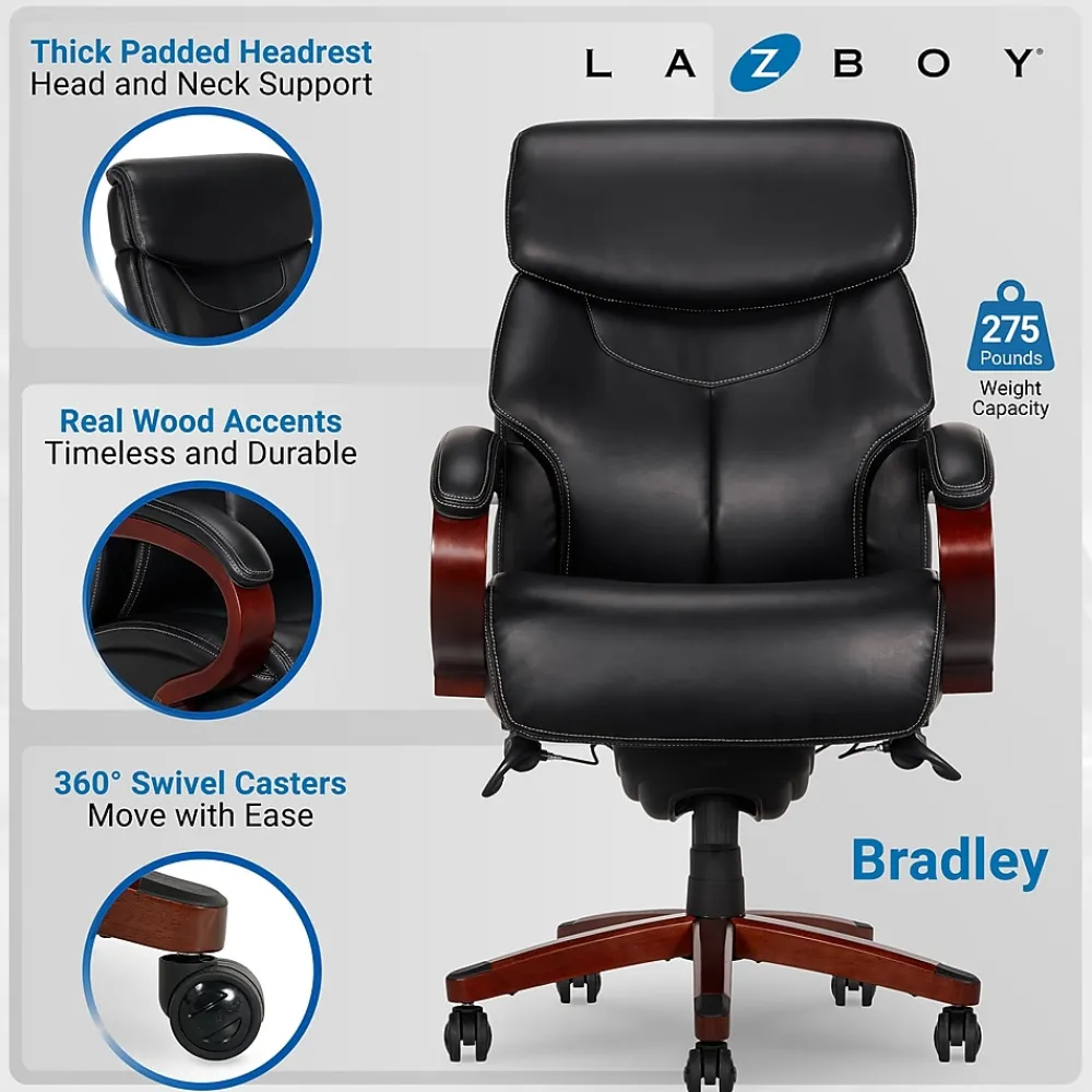 Create a bold, modern look for your office with this La-Z-Boy Bradley executive office chair. The rich bonded leather upholstery and contrast stitching deliver upscale style, while the plush ComfortCore cushioning ensures all-over support. A waterfall seat design promotes better circulation so you can sit comfortably for longer. This chair boasts pneumatic seat height adjustment, tilt tension and tilt lock, providing convenient customization options. Fixed padded loop arms offer a place to way to rest your shoulders, hands and wrists after marathon typing sessions. Featuring a wood-finish five-star base and rolling casters, this La-Z-Boy Bradley executive office chair moves effortlessly from one side of your office to the other.
