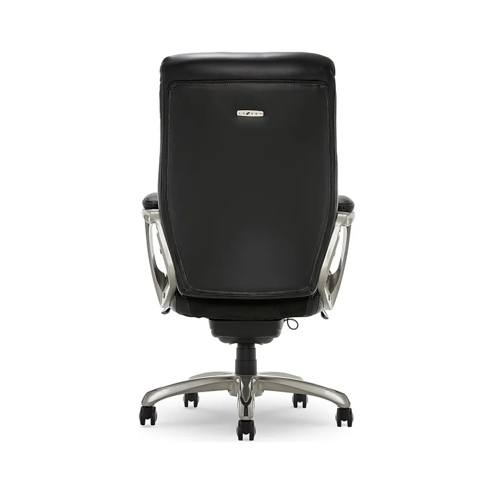 Combining advanced comfort technology with a timeless style, the La-Z-Boy Cantania executive office chair is a smart choice for any office, home, or entertainment space. This chair features flexible AIR lumbar technology that pivots and conforms to the lumbar area according to your movement, helping improve posture and reduce discomfort. It is also designed with Comfort Core Plus memory foam cushions, which is an advanced layering system that offers zone-based support with cushioning in the areas you need it most. The strategically placed plush body pillows and padded headrest combine to provide neck support and minimize pressure points, helping you feel more rested after long days at work. The ergonomic chair is fully adjustable for optimized body alignment. Crafted with silver color painted components, this high-back office chair with hand-sculpted arms is upholstered in a soft bonded leather to deliver comfortable, contemporary style to any work space.