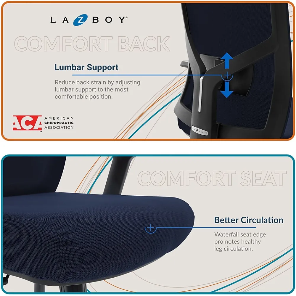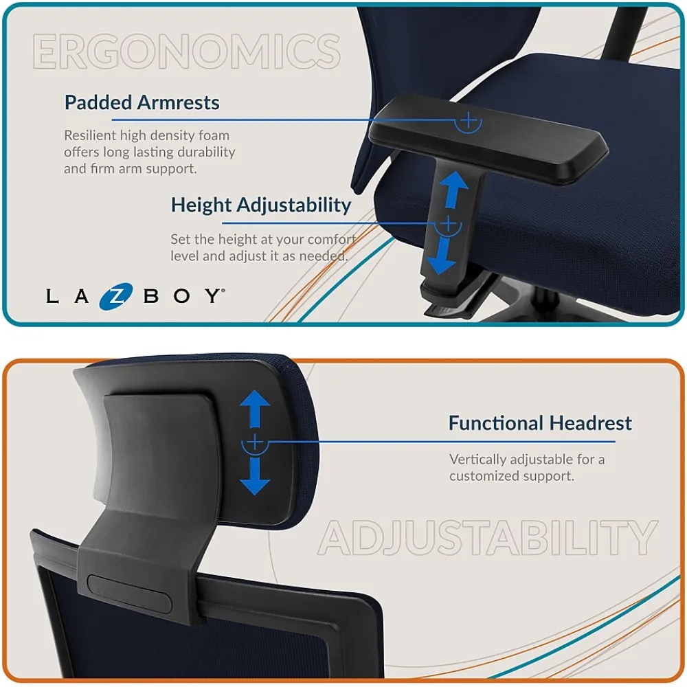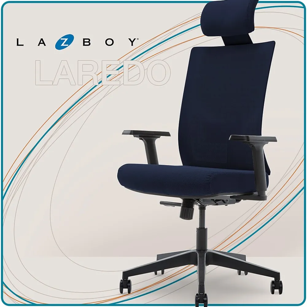The La-Z-Boy executive mesh office chair is designed with the values of comfort, innovation, and outstanding craftsmanship. The premium butterfly synchro seat plate boasts three locking positions to secure your favorite seating position while you work. The heavy-duty base glides effortlessly on smooth-rolling wheels. This La-Z-Boy executive mesh office chair takes it a step further by introducing a high back with a comforting headrest for extended stays at your desk.