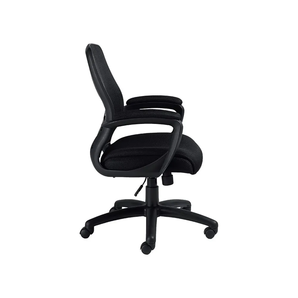 Go easy on your joints with this Offices To Go black mesh manager’s chair. The back is made with synthetic mesh fabric for lightweight breathability and comfort, while the swivel and tilt features let you customize the chair to fit your body perfectly. This chair features a scuff-resistant arched base and twin-wheel carpet casters for easy rolling across multiple surfaces. With a generously proportioned waterfall-shaped seat that alleviates stress on your knees and the padded adjustable armrests that provide support for your elbows and shoulders, this Offices To Go black mesh manager’s chair is ideal when you’re working long hours at a desk or computer.