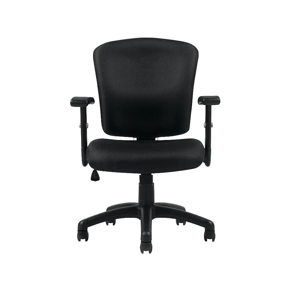 - Stocked in durable, patterned black fabric upholstery