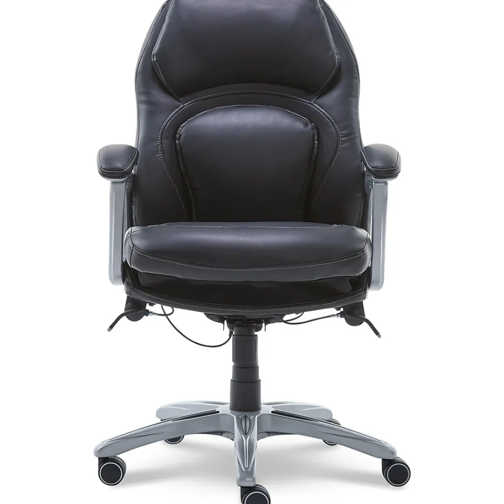 Enjoy the comfort of a seat primed for wellness with the Serta Wellness by Design Executive Office Chair. This innovative desk chair features Back in Motion Active Seating Technology, which corrects your posture by tilting your pelvis forward when you lean, keeping your spine in a neutral position. This ergonomic office chair helps you use proper body mechanics, reducing strain and stress while improving spinal health. It is designed with layered body pillows to provide optimal support and features heavy-duty 60-millimeter casters for smooth mobility.