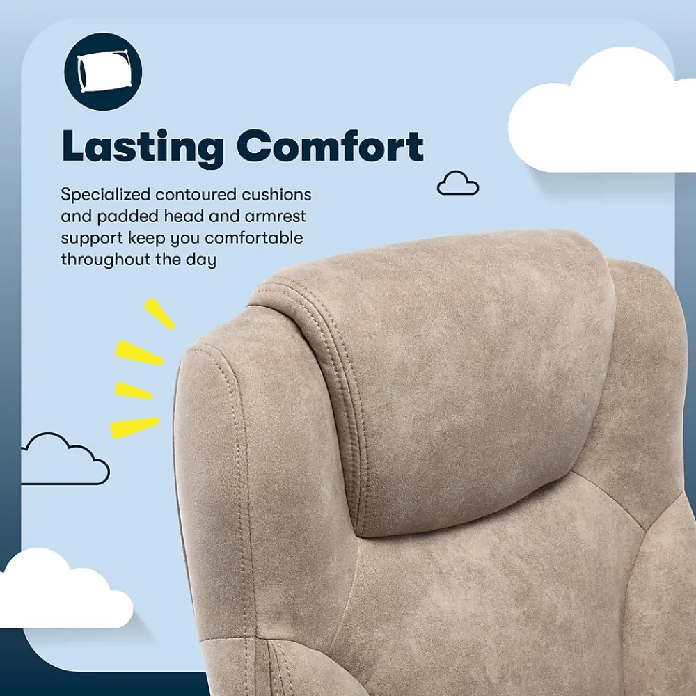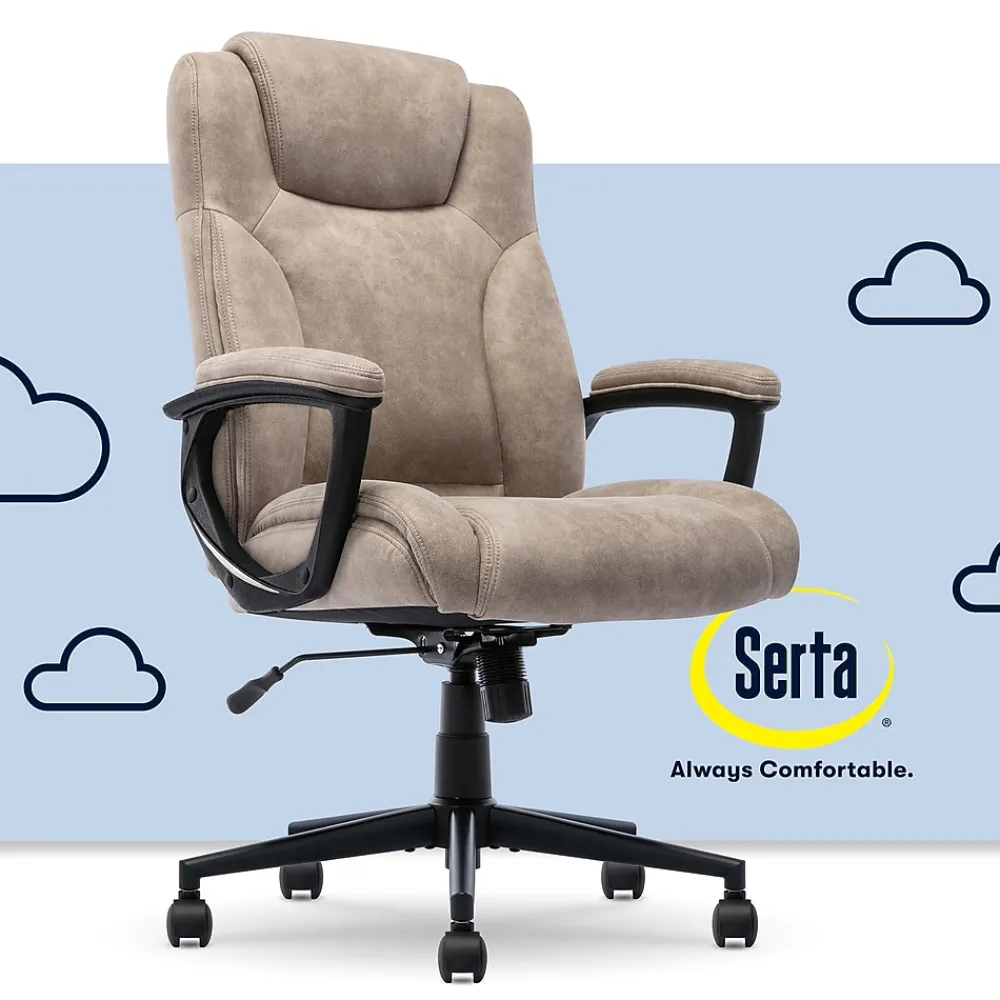 The better you sit, the better you’ll feel. Whether for work, play, or any other activity that has you sitting in our chairs, we believe comfort is everything. We know it’s a big responsibility and take it seriously, just as we do with our mattresses. With over 15 years of making chairs and innovating with designs, materials, and technology, Serta knows what it takes to give you a comfortable sit. Crush your to-do list and conquer the workday with the Comfort Eco chair. This modern desk chair focuses on prioritizing your well-being without compromising on style. Its simple and sleek form, sculpted arms, and piped edges with tailored double-stitching bring a sophisticated style fit for any executive workspace. Mindful of the way your body sits and moves, the ergonomic mid-back adapts to your posture with gentle contours that conform to your natural spinal curves. The lumbar support also takes the strain off your lower back and encourages you to sit without slouching. Sitting at your desk all day is easier with padded body pillows in the backrest that relieve tension and pressure. The waterfall edge seat keeps you comfortable with layered contours and a semi-plush cushion that’s stuffed with high-density foam. Covered in luxuriously soft velvet with 4 neutral colors in Brown, Black, Light Gray, and Light Brown, find the right shade to complement your decor. The 360° swivel base on double-wheel casters glides smoothly across carpets or rugs, and can handle up to 275 lbs. Finding your ideal seated position is a breeze with the one-touch side lever for convenient height adjustment and tilt-lock to match your work set-up. The Serta Comfort Eco chair will be a welcoming work companion for the busy body in the office or at home. Whether you’re answering emails, hopping on video calls, or diving deep into your work, this reliable chair will provide the comfort and support you need to stay productive.