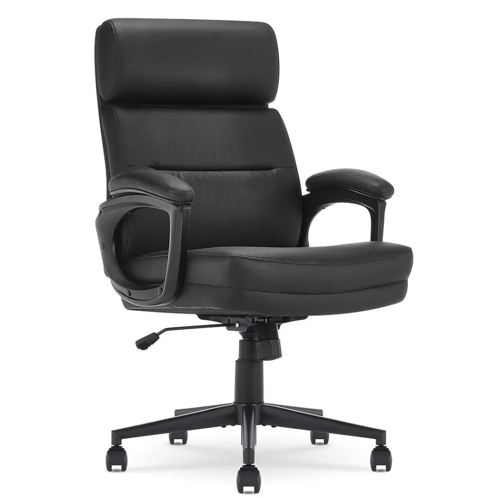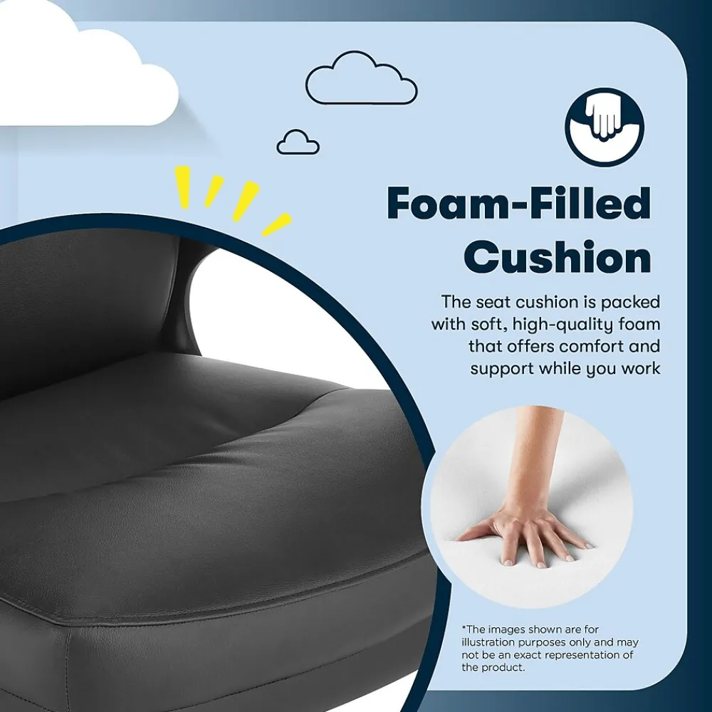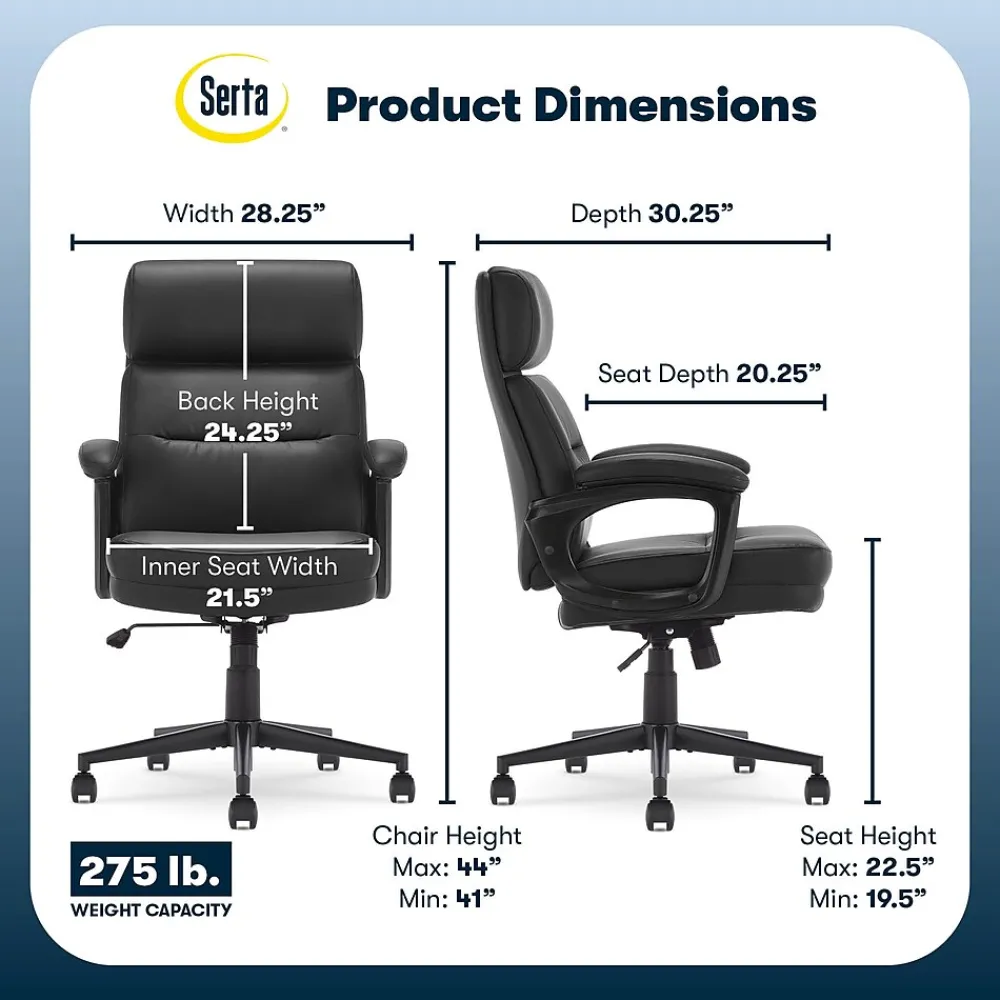 The better you sit, the better you’ll feel. Whether for work, play, or any other activity that has you sitting in our chairs, we believe comfort is everything. We know it’s a big responsibility and take it seriously, just as we do with our mattresses. With over 15 years of making chairs and innovating with designs, materials, and technology, Serta knows what it takes to give you a comfortable sit. The Serta Comfort series of office chairs offers a luxuriously cushioned seat, backrest, and armrests filled with thick, non-recycled Serta foam and upholstered in a soft breathable bonded leather to keep you cool and comfortable during extended use. This chair seamlessly blends its comfort with a sleek design accented by a single channel tuft. Choose from Black, Brown, Gray, or Cognac to find the perfect match for your workspace. This executive model is a mid-back design. Mid-back chairs can be beneficial for those who tend to slouch in high-back chairs, as the lower lumbar support encourages active sitting and prioritize core engagement. It will also enable you to shift positions and stretch more easily throughout the day, helping to prevent muscle fatigue and discomfort that can lead to poor posture. The 360° swivel metal base on double-wheel casters glides smoothly across carpets or rugs, and can handle up to 275 lbs. Finding your ideal seated position is easy with the one-touch side lever for convenient height adjustment to match your work style and desk set-up. Designed for comfort, but delivering stylish ergonomics, the Serta Comfort Executive Mid-Back Chair is your workday partner for crushing emails, pumping out a project or slaying your study time.