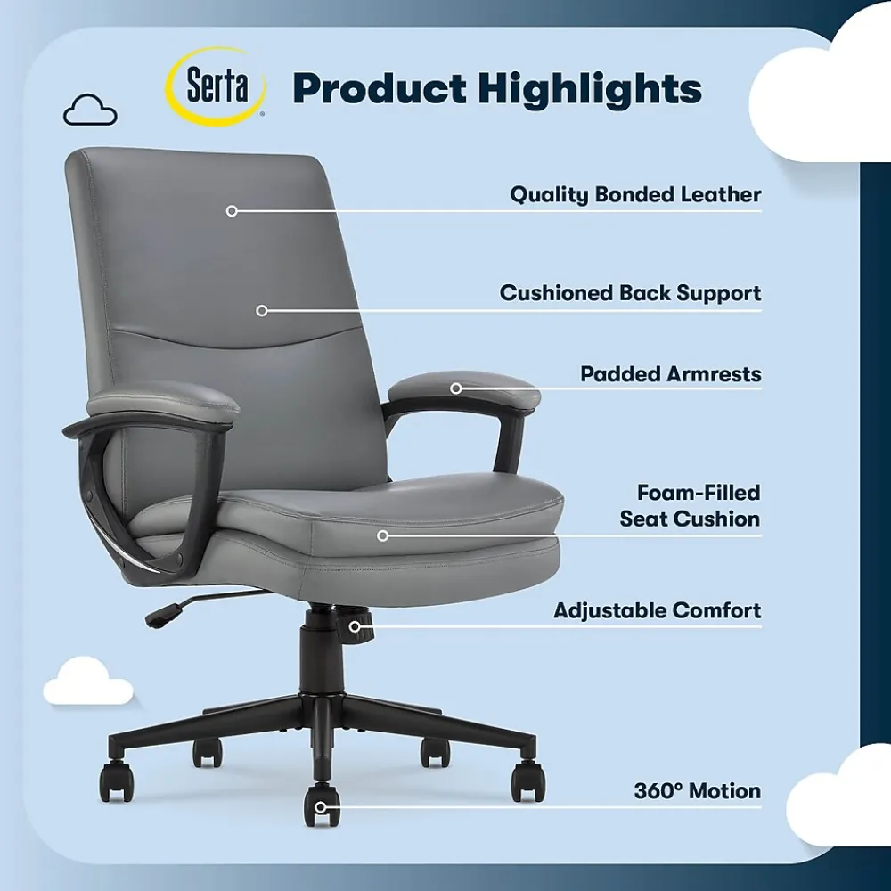 The better you sit, the better you’ll feel. Whether for work, play, or any other activity that has you sitting in our chairs, we believe comfort is everything. We know it’s a big responsibility and take it seriously, just as we do with our mattresses. With over 15 years of making chairs and innovating with designs, materials, and technology, Serta knows what it takes to give you a comfortable sit. Unwind, recharge, and conquer your workday with the Serta Comfort Modern Executive Office Chair. Featuring plush mid-back support, clean lines, luxurious channel-tufting and sculpted arms, this chair will elevate any space. A semi-plush, double-layer cushion seat with generously padded back and armrests provides ample lumbar support and will help you maintain a positive ergonomic posture while surrounding you in comfort. Thick non-recycled Serta quality foam is upholstered in a soft to touch breathable bonded leather to keep you cool during extended sitting times. Available in Black, Brown, Gray, or Cognac with matte black components. A 360º swivel metal base gives you mobility throughout the day and handles weight up to 275 lbs. Plus, the double-wheel casters ensure smooth gliding over rugs and carpet floors so you can scoot around your workspace with ease. Finding your ideal seated position is a breeze with the convenient seat-side lever. Simply adjust the height to perfectly match your stature and desk setup for a personalized fit. A perfect workday companion that adapts to your needs, the Serta Comfort Modern is made for productivity and well-being whether you’re tackling the day from a corner office or at home in the bedroom.