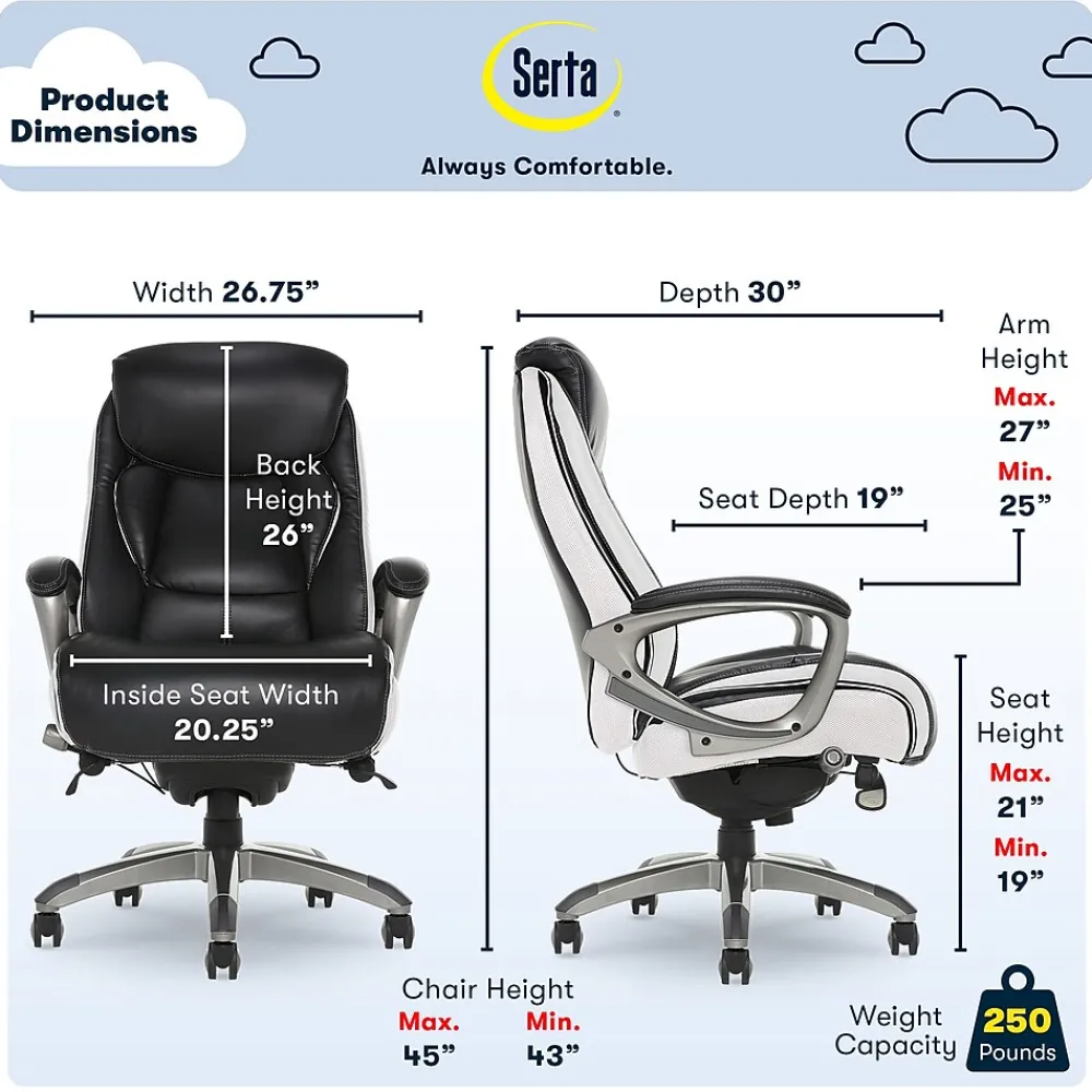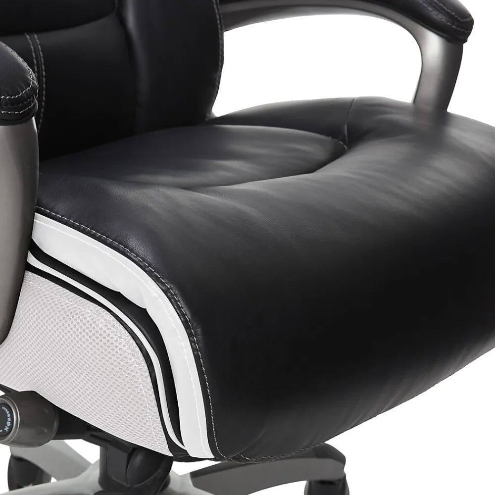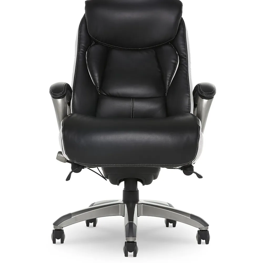 Find a reason to relax during your workday with this executive office chair from Serta, a brand known for quality and comfort. This ergonomic desk chair has layered body pillows and a pillowed headrest to provide ease while seated for long periods of time. The hand-sculpted arms and smooth bonded leather upholstery have a sleek, professional look that stands out in any work environment. Fully adjustable, this executive office chair allows the user to customize the height and lumbar zone for optimal comfort. This desk chair has a five-layer cushioning system for all day comfort and support.