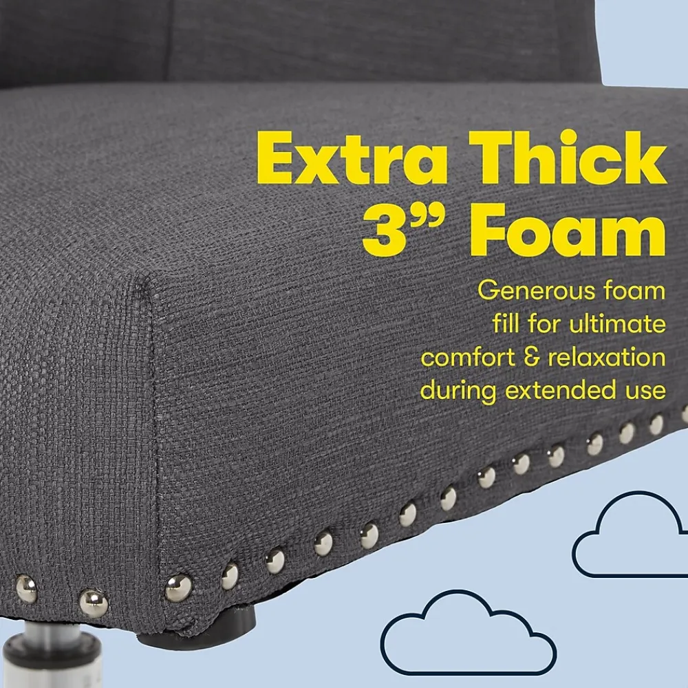 - Upholstered in graphite color twill fabric; chrome-finished stainless steel base with casters offers 360-degree mobility