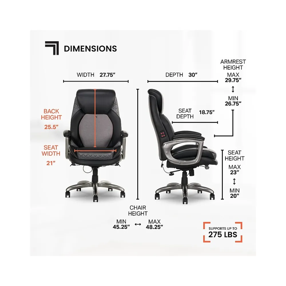 - Padded armrests adjust from 26.75″ to 29.75″H for an ergonomic posture support