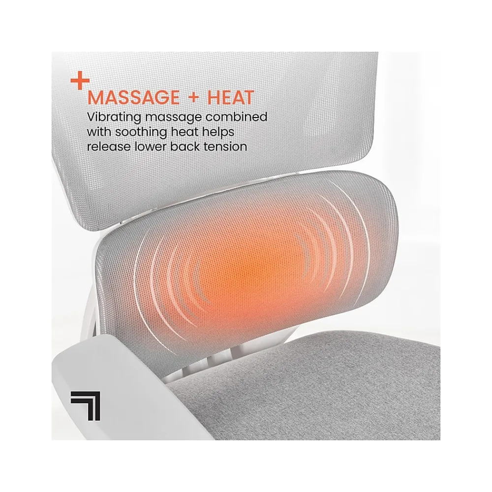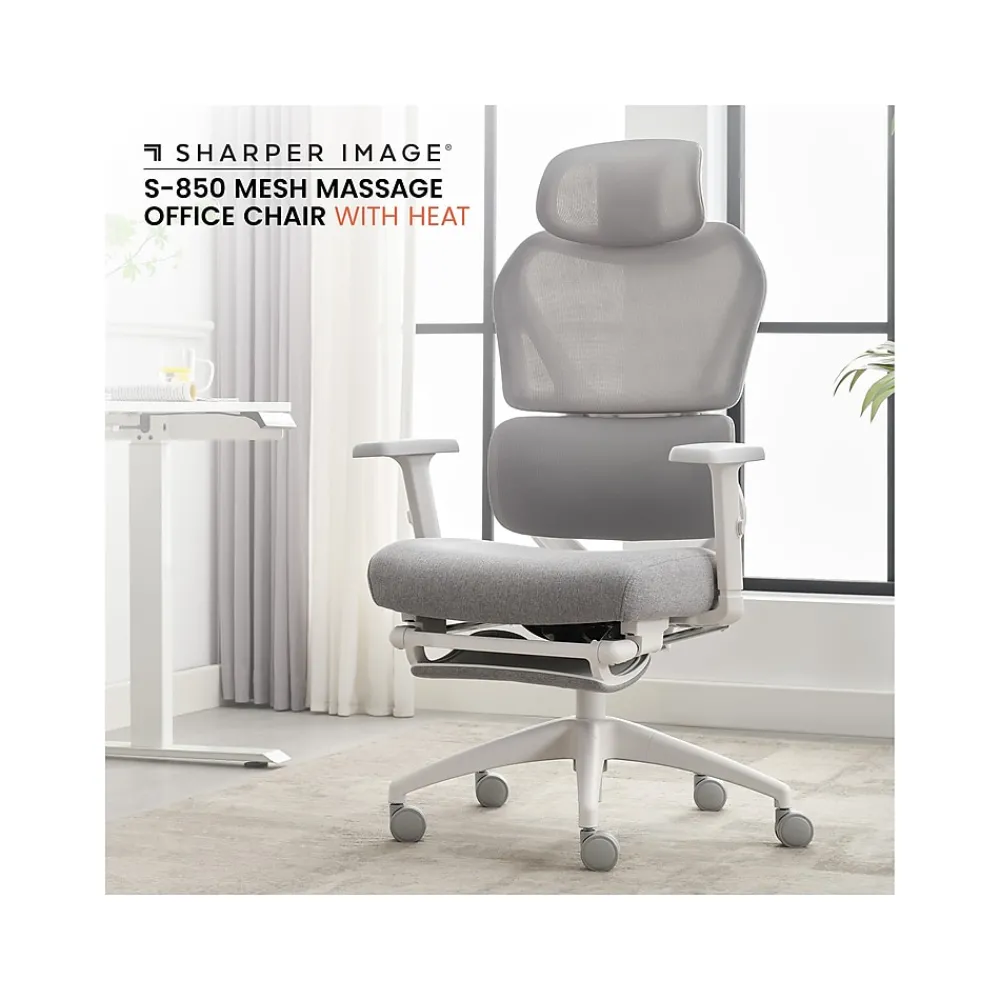 Upgrade your workspace with the Sharper Image S-850 innovative massage office chair. The high-tech, breathable mesh design comes with built-in soothing, heated lumbar massagers that help with muscle relaxation to provide ultimate comfort. The adjustable headrest, SynchroTech seat plate, armrests, and fully extendable footrest let you personalize your relaxation throughout the day. Designed with premium materials for lasting comfort and 360-degree swivel casters for ease of movement.