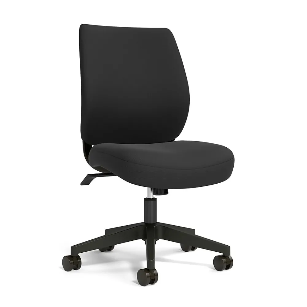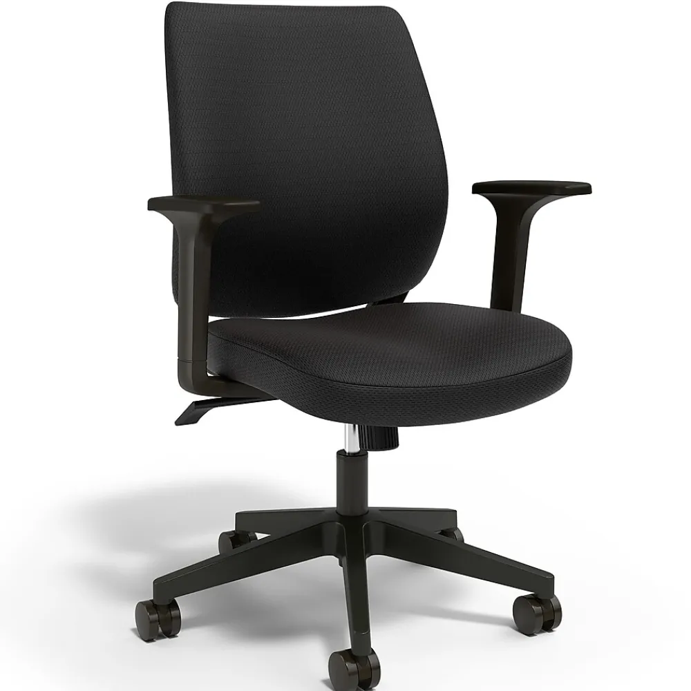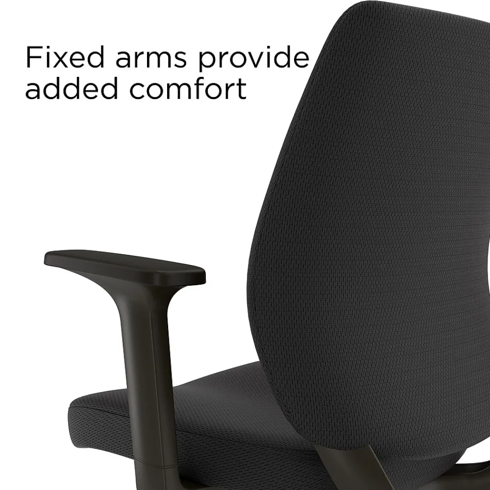 Work in comfort as you knock out your deliverables with this black fabric chair. Five swiveling casters give you full mobility around your work area, while the fabric upholstery of the contoured back and amply padded seat give you support all day, every day. Adjustable height, recline and tilt let you customize your seating for your own perfect posture and screen usage. This versatile task chair can be assembled with or without the fixed armrests, giving you a premium frame that meets ANSI/BIFMA standards at a great value. Reliable, efficient and versatile – the Staples Essentials fabric chair.