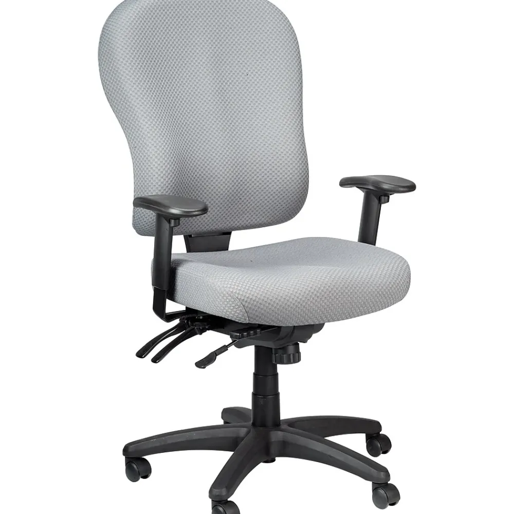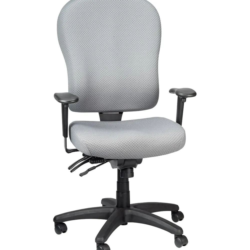 Tempur-Pedic® Ergonomic fabric mid-back task chair provides height and width adjustable arms, center tilt with lock, forward tilt and tilt tension. Chair features a grey polyester fabric upholstery seat to provide durability and extended comfort.