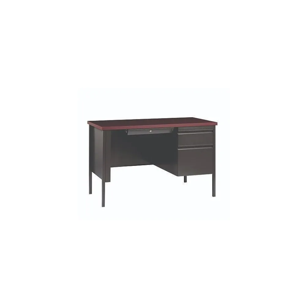 Built with a durable, powder-coated steel frame with 1″ square tubular steel legs. Standard features include full extension ball-bearing drawer slides for smooth drawer action, central locking center drawer, and a strong laminate wood top. Desks ship fully assembled except for the legs. All necessary hardware to attach the legs is included. Designed to meet or exceed ANSI-BIFMA industry standards for performance and workmanship.