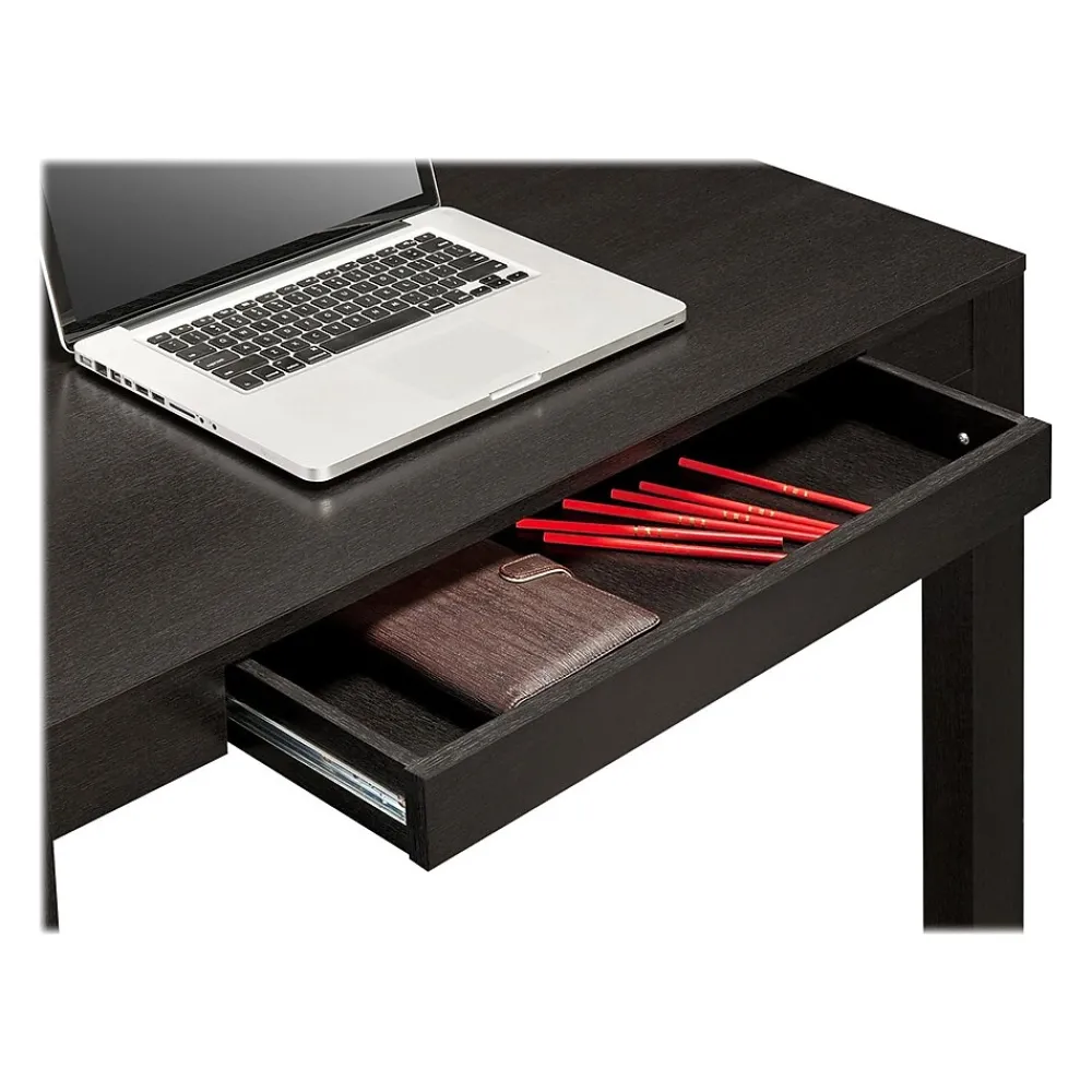 Redefine your workspace or any room in your home with the sleek, minimalist lines of this attractive Ameriwood Home Parsons Desk with Drawer. The Desk features a small center storage drawer that’s perfect for pens, paper, computer peripherals and other small office supplies. Don’t let your workspace suffer when you have nice, affordable options with this laminated particleboard and MDF desk. Parsons Desk top comes preassembled, just attach the 4 legs to finish the assembly.
