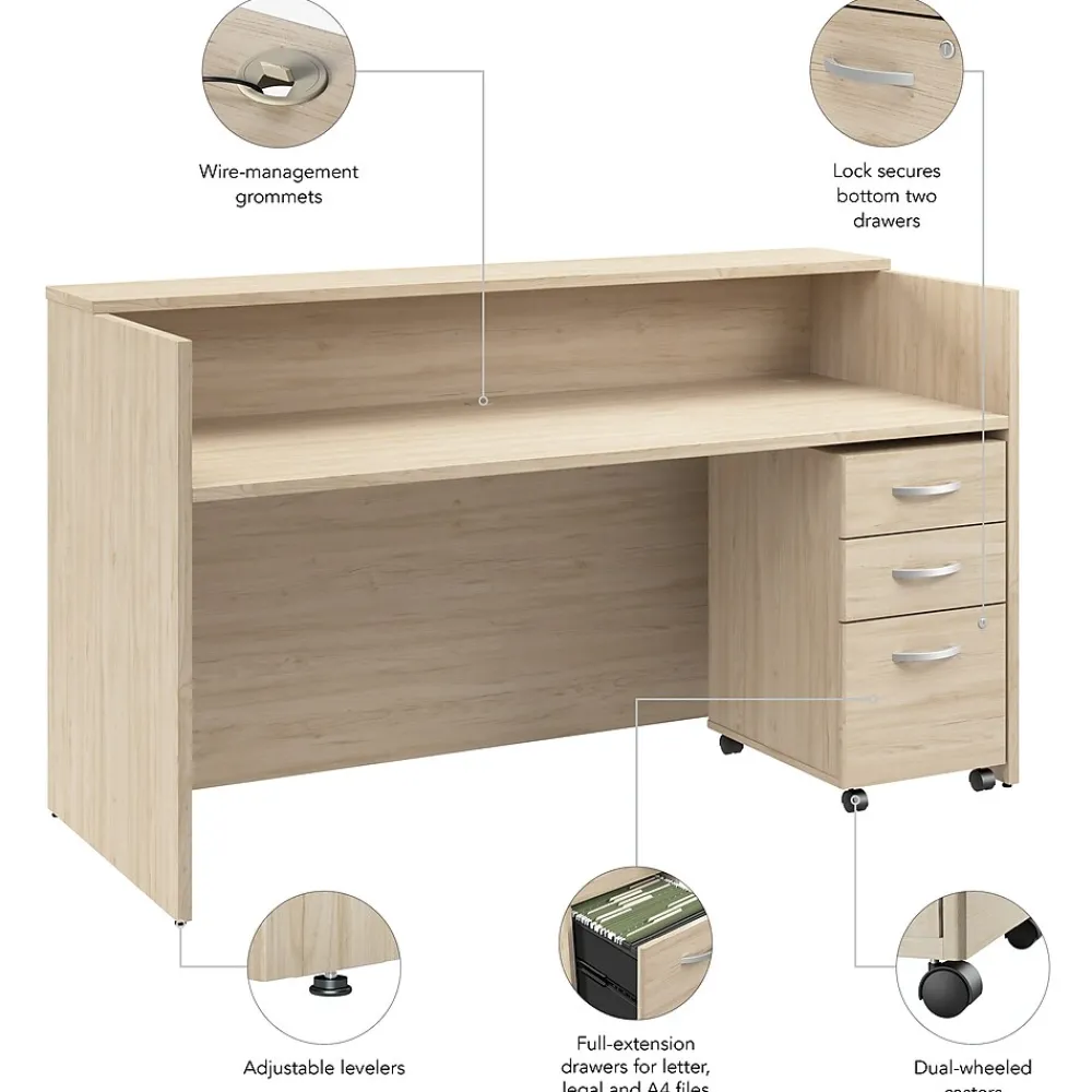 The Bush Business Furniture Arrive 72W x 30D Reception Desk with Shelf and Mobile File Cabinet provides a stylish and practical solution for welcoming guests to your office’s waiting room. Greet clients, patients, and other visitors at a front desk that includes a raised shelf for signing in and completing paperwork. The durable thermally fused laminate surface protects against scratches and stains while a 200-pound weight capacity and built-in wire management grommets accommodate multiple monitors and other equipment. The rolling file cabinet features one drawer for letter, legal, and A4-size paperwork as well as two drawers for supplies. This commercial-grade receptionist desk with drawers has been meticulously tested to meet or exceed ANSI/BIFMA quality standards for safety, durability, and performance and is backed by a 10 Year Warranty. American made with U.S. and imported parts.
