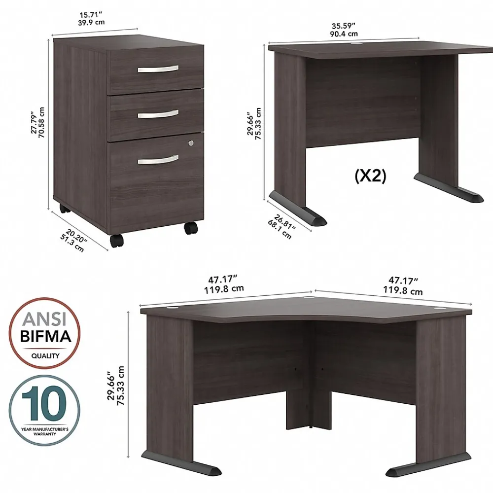 - Bundle includes: 48″W corner computer desk, set of two 36″W small computer desks, and three-drawer mobile file cabinet