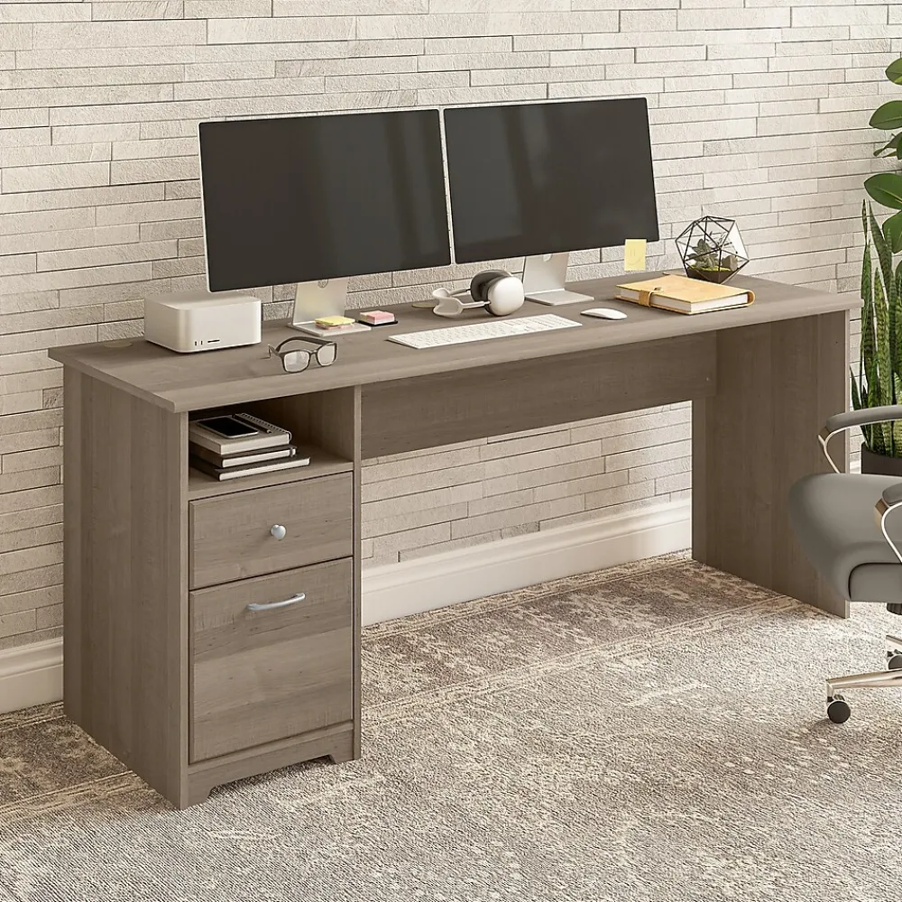 The Bush Furniture Cabot 72W Computer Desk with Drawers presents a home office solution with transitional style. Take advantage of the 72-inch desk surface to spread out with a computer, books, and all the materials you need to power through your next project or assignment. The durable desktop supports up to 200 pounds and includes built-in wire management to keep cords and cables out of the way while you work. A single file drawer opens on smooth full-extension ball bearing slides for an effortless reach to letter, legal, and A4-size paperwork. The box drawer organizes writing utensils, notepads, and other small office supplies while the open cubby shelf is perfect for work-in-progress and frequently used materials. This home office desk with storage has been rigorously tested to meet or exceed ANSI/SOHO quality standards for safety and performance and is backed by a 1 Year Warranty.