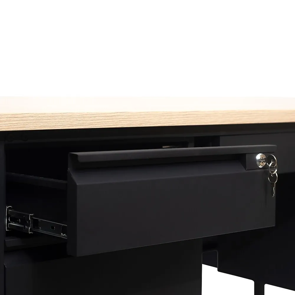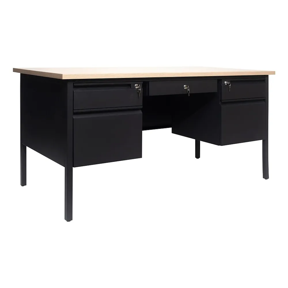Give teachers and office workers alike a dedicated space for their tasks that is both functional and professional with this commercial grade double pedestal desk. Featuring a 1″ thick long-lasting laminate top, steel frame, and 5 locking drawers with ball bearing drawer slides, this multipurpose desk will stand up to the rigors of daily use. The premium materials allow this metal and wood desk to hold up to 300 lbs. static weight while the self-leveling floor glides ensure a level work surface. Assembly takes 30 minutes or less and a damp cloth is all that is needed to maintain the appearance of this must-have work space.