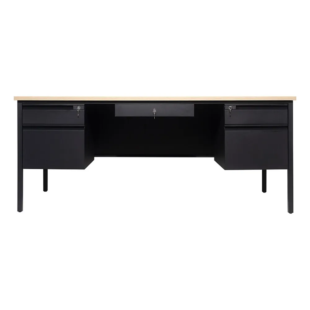 Give teachers and office workers alike a dedicated space for their tasks that is both functional and professional with this commercial grade double pedestal desk. Featuring a 1″ thick long-lasting laminate top, steel frame, and 5 locking drawers with ball bearing drawer slides, this multipurpose desk will stand up to the rigors of daily use. The premium materials allow this metal and wood desk to hold up to 300 lbs. static weight while the self-leveling floor glides ensure a level work surface. Assembly takes 30 minutes or less and a damp cloth is all that is needed to maintain the appearance of this must-have work space.