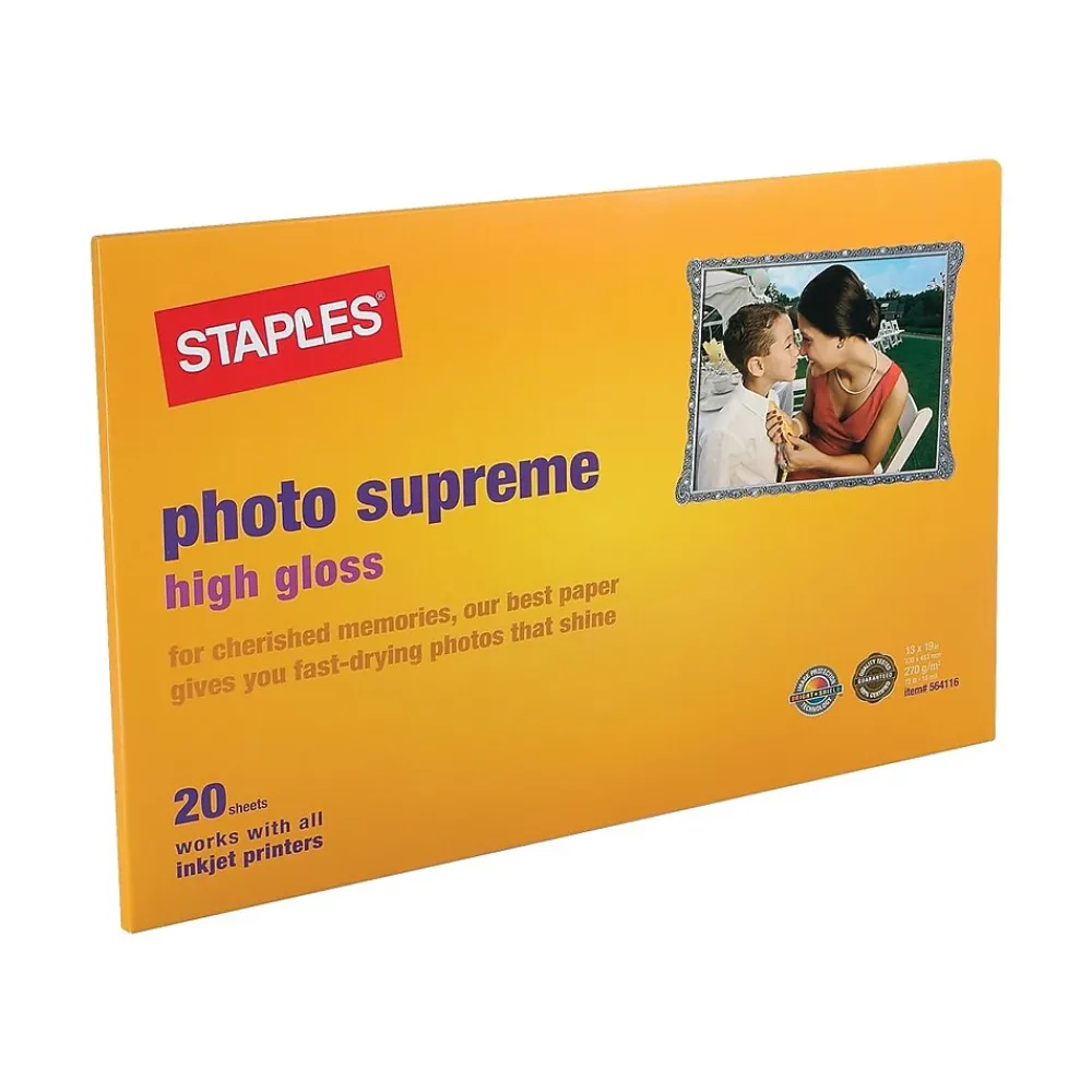 Make images look glossy and professional with this photo supreme gloss paper. Each page is tear and curl resistant for a high-quality look, while the acid-free material keeps it from yellowing or crumbling over time. The generous proportions of this Staples photo supreme gloss paper make it ideal for printing large photos and other images.