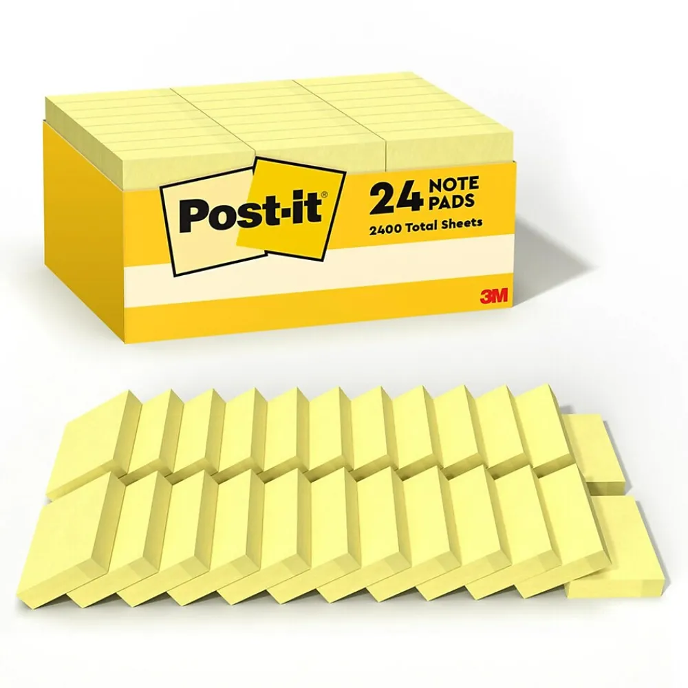 Post-it Notes in 1 3/8 in x 1 7/8 in stick securely and remove cleanly, featuring a unique adhesive designed for use on paper. America’s #1 favorite sticky note, they are great to call out important information or leave notes in calendars or planners. The small size is great to jot down a quick phone number or short note. Canary yellow color helps your notes stand out. Post-it Notes are recyclable, and the paper in Post-it Notes is sourced from certified, renewable and responsibly managed forests. 100 Sheets/Pad. 24 Pads/Pack.