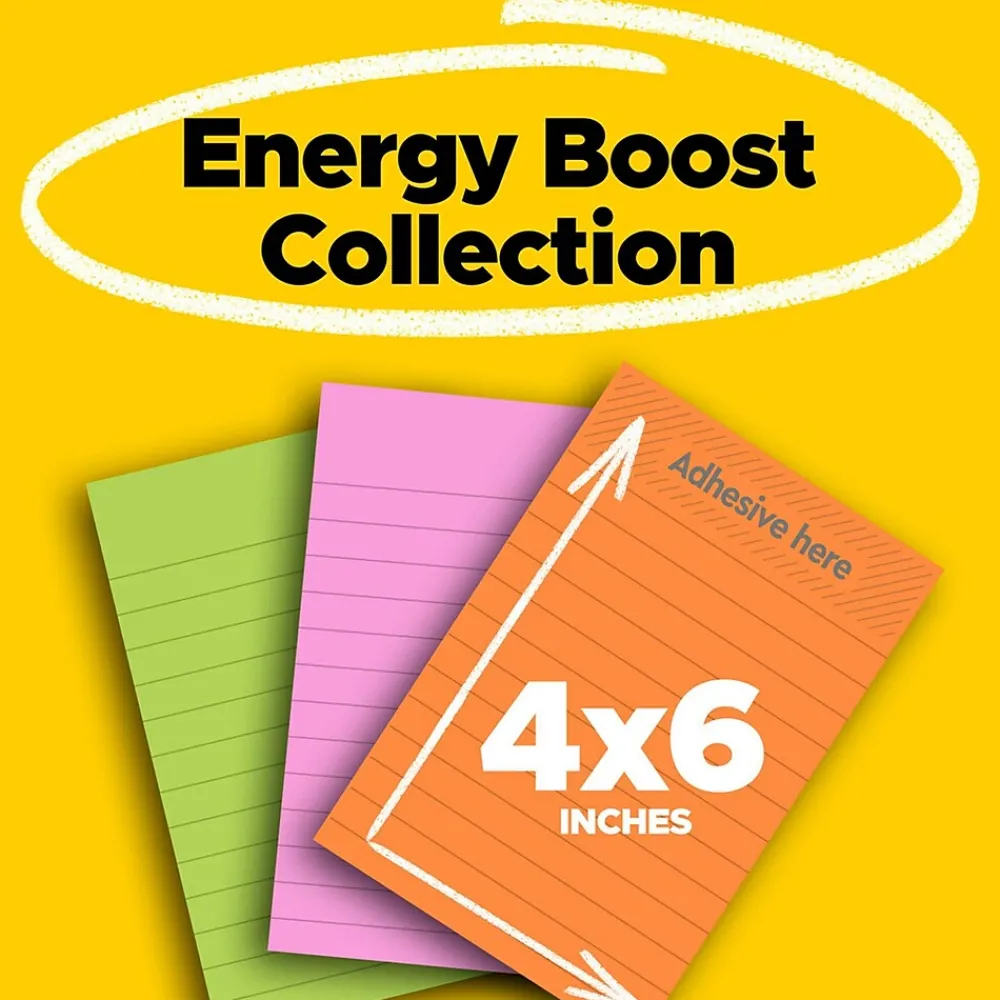 Uplift your spirits and messages via the vibrant, strong colors of the Energy Boost collection. Whether jotting down your daily to-do’s, brainstorming big ideas, studying or setting reminders, colors and ideas are always brighter together. These sticky notes feature 2X the sticking power. They also stick and re-stick – allowing you to move your notes with you throughout your day. They’re ideal for walls, doors, windows and other vertical surfaces, and like all Post-it Notes, they stick securely yet remove cleanly without damage. Keep your ideas across your notebooks, classroom books, calendars or other documents. No tape or tacks are needed with adhesive notes, saving you money and time on office products or school supplies. A great memo pad, these are ideal for using for notes or reminders to yourself or others. Post-it Super Sticky Notes are the perfect solution for shopping lists, reminders, notes on computer screens, time tracking, to-do lists, marking cables, color-coding documents, reminding kids to do chores, storyboarding, scratch paper and agile processing. Each notes sheet is approximately 4 in. x 6 in., with 90 sheets per pad and 3 sticky note pads per pack. These colorful sticky notes include colors from the Energy Boost collection including orange, pink and green. All Post-it Notes are sourced from certified, renewable and responsibly managed forests, and all Post-it Notes are recyclable, so you can recycle them when they are no longer needed.