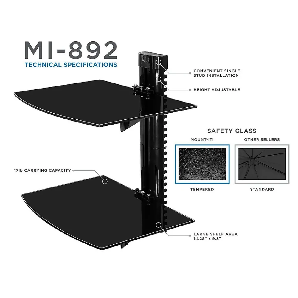Mount-It! MI-892 floating wall mounted shelves allow you to get rid of your floorstanding TV furniture and complement the look of your wall mounted flat screen television. The single shelf allows you to place DVD players, cable boxes and other AV components on the wall. Use multiple of these units to design a complete home theater system. The shelving system is very durable and can carry up to 22 pounds of weight. Made from sturdy Aluminum and tempered glass. Its large surface area can easily hold gaming systems and BluRay DVD players.