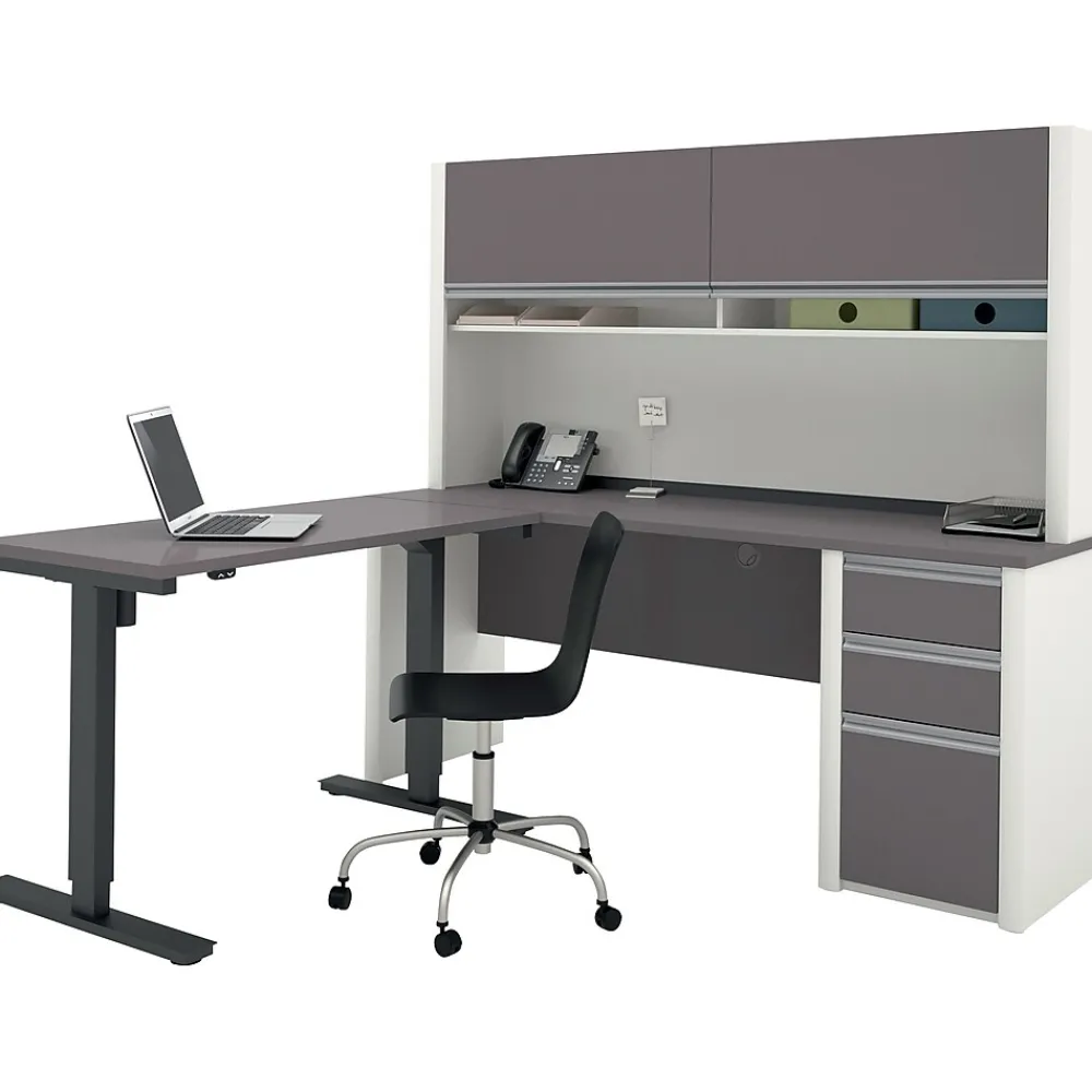 Bestar Connexion L-Desk with Hutch including Electric Height Adjustable Table in Slate & Sandstone